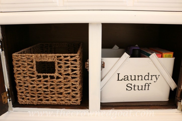 while the bottom holds various household supplies we use every day. If you have children or curious pets make sure all products and chemicals are locked away and out of their reach. As always, use common sense and caution when deciding the best use of laundry room storage cabinets.