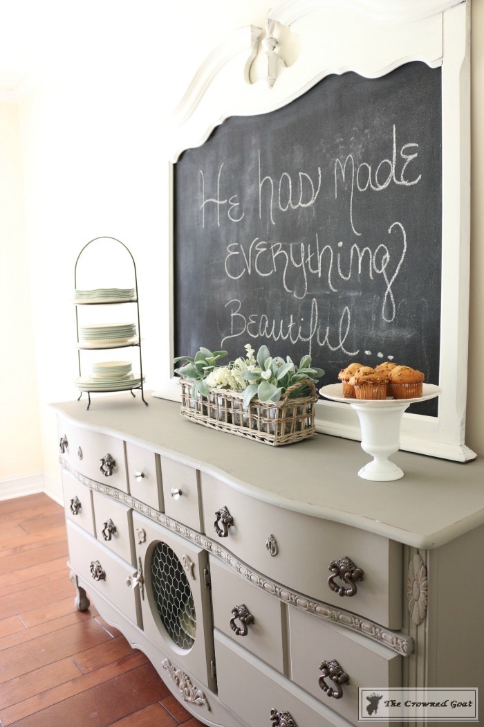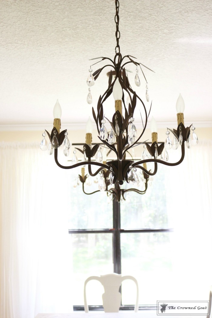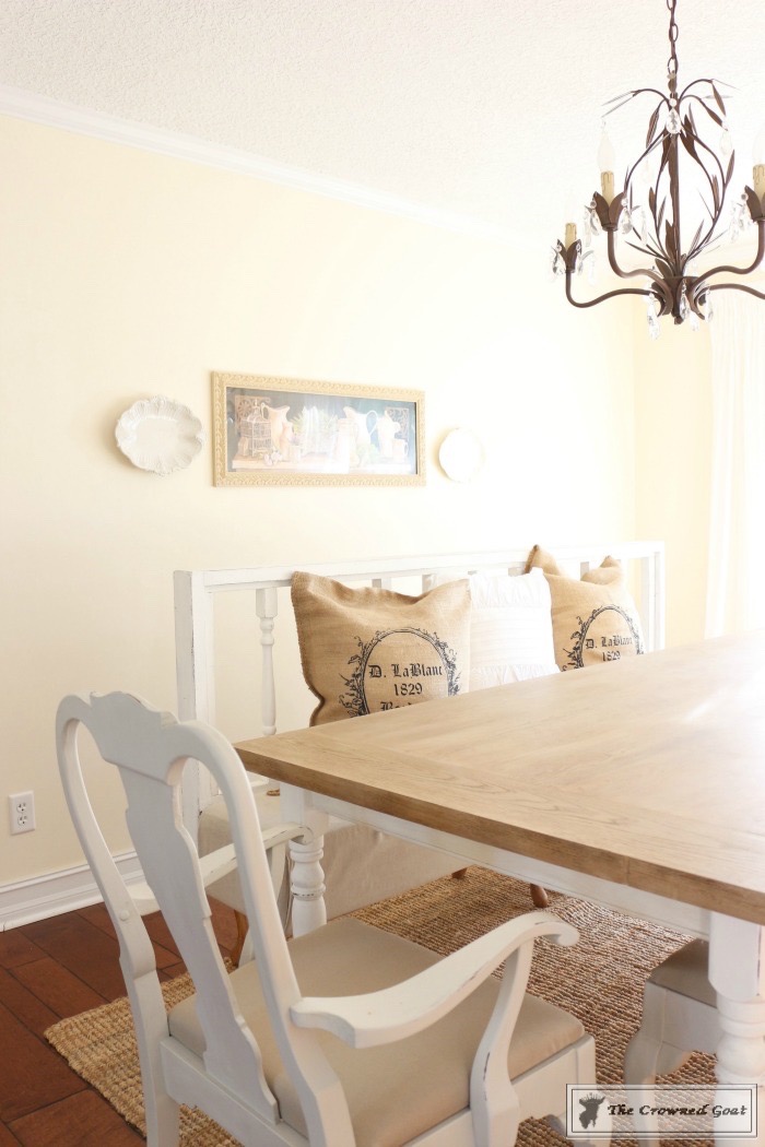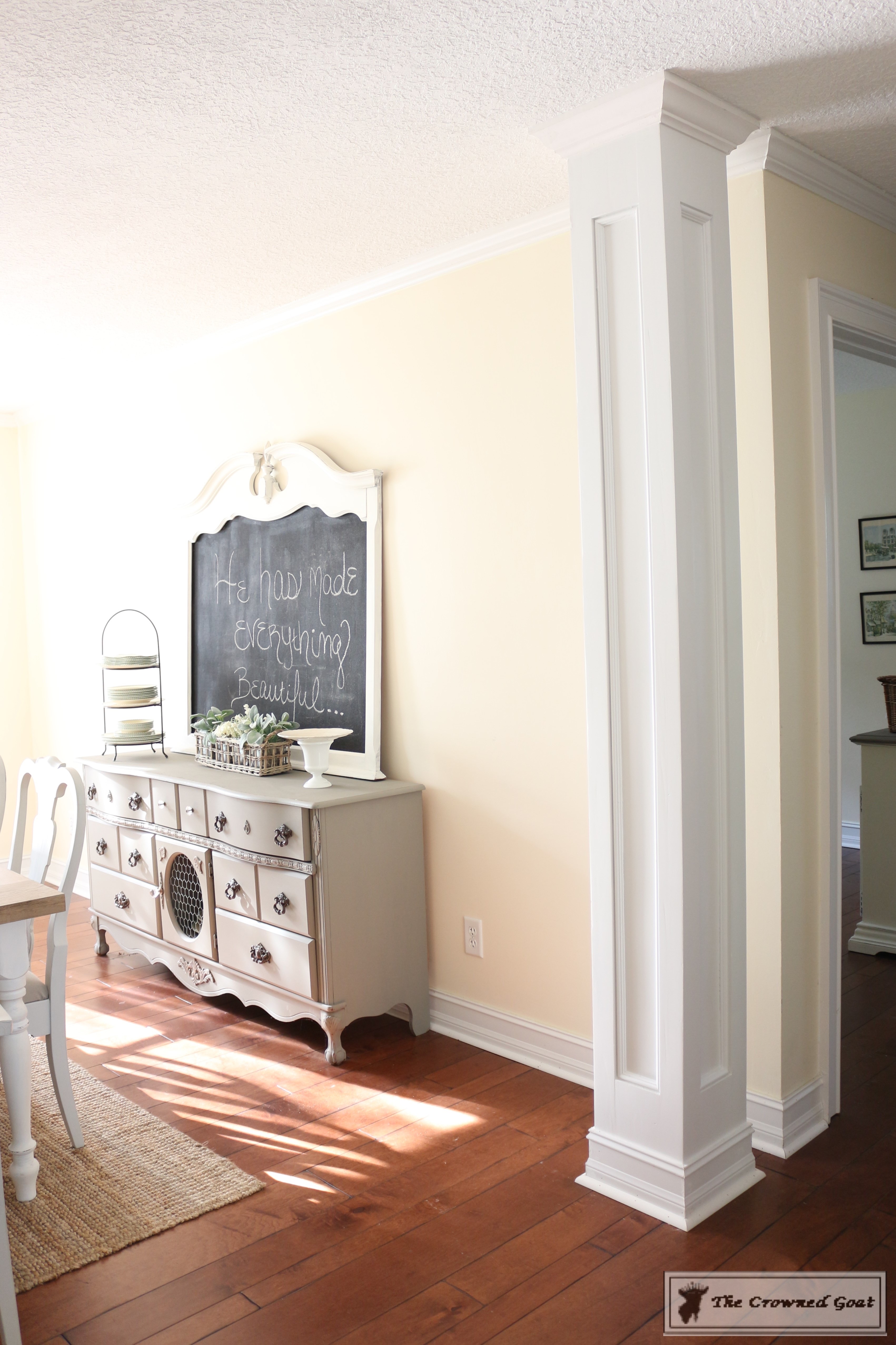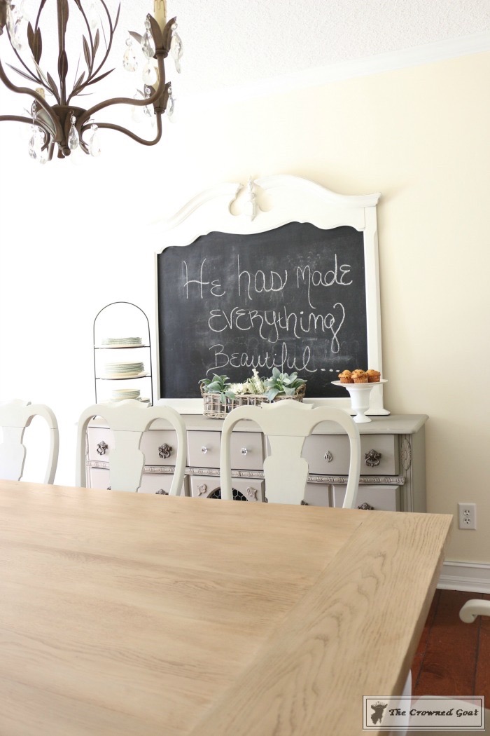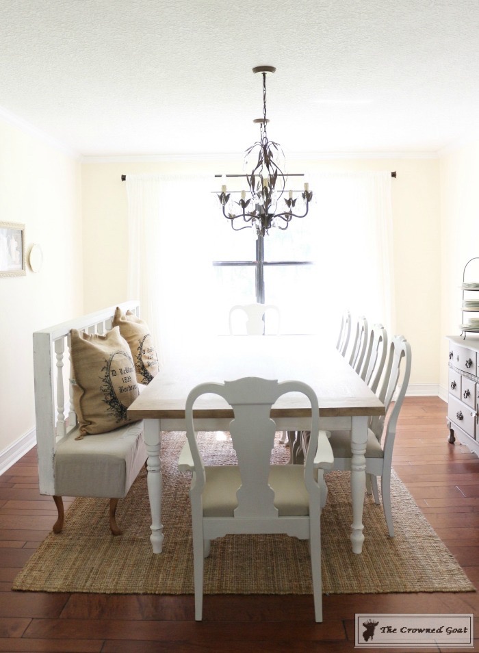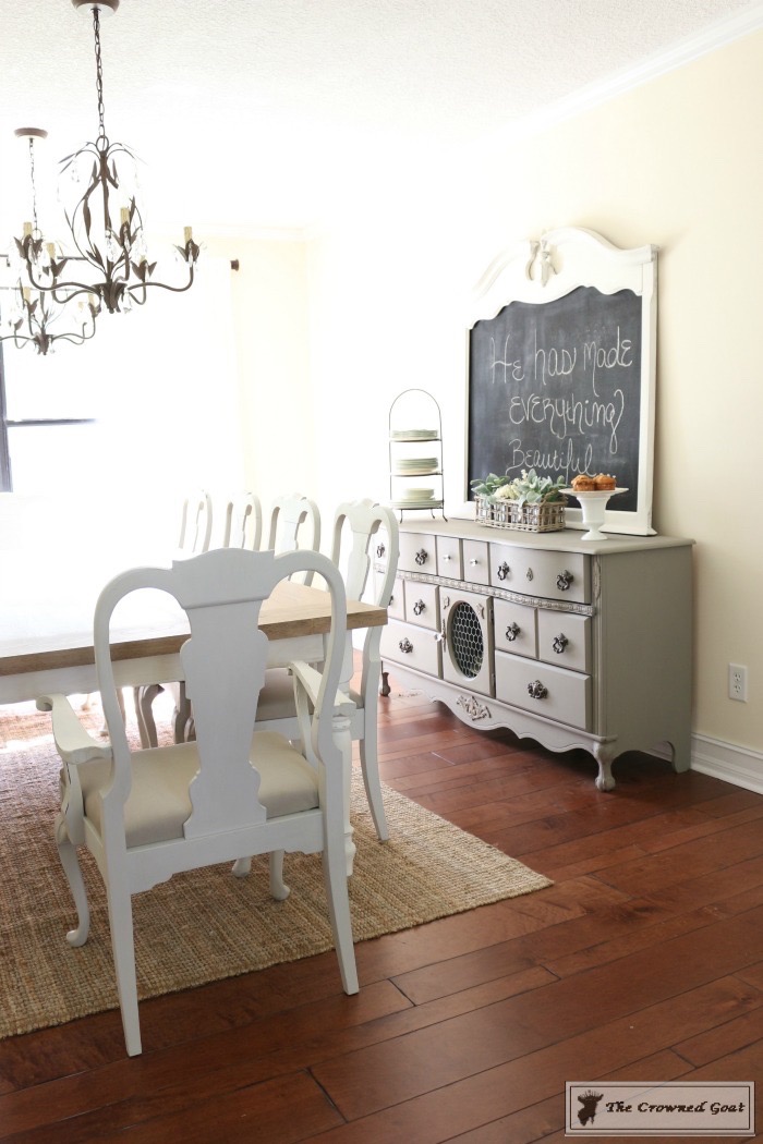The room was definitely a team effort. My dad made the table and built the columns, I painted the buffet, my mom and I painted the chairs, my bestie S helped build the bench and I painted the chalk board. The smocked curtains are from Pottery Barn and the chandeliers are from Home Depot.