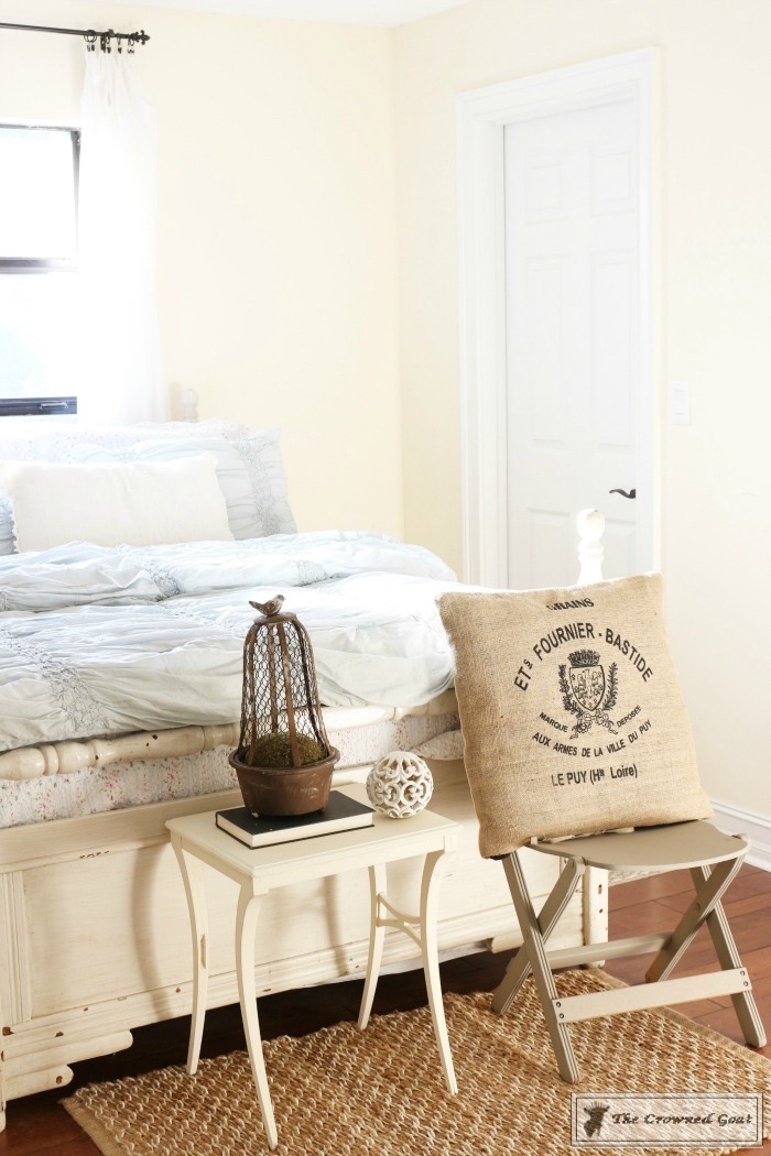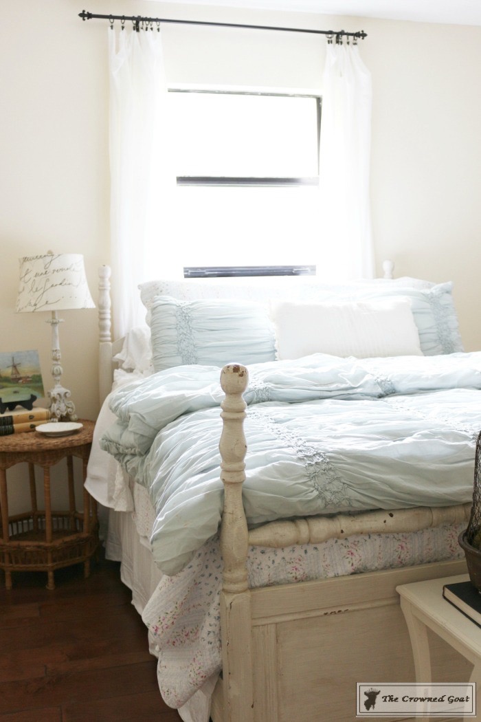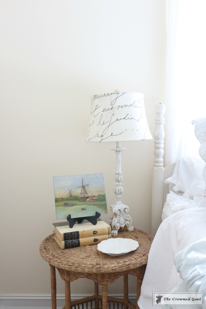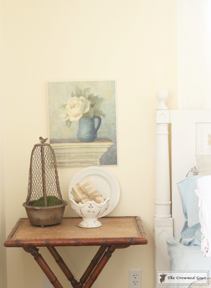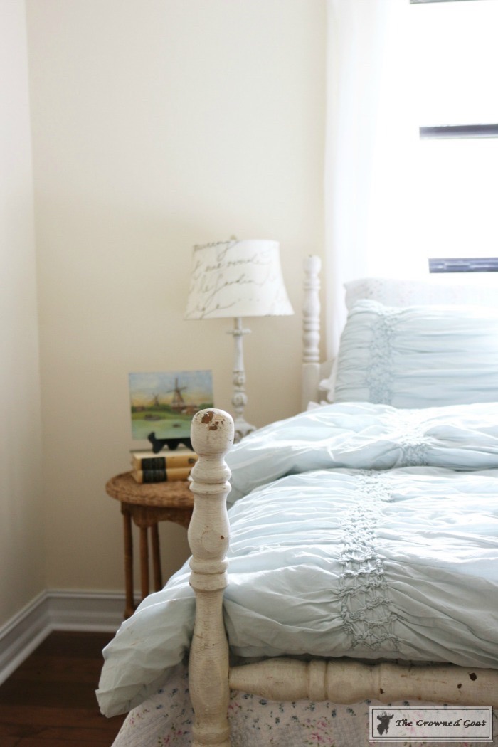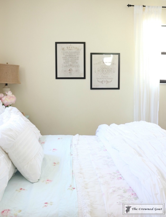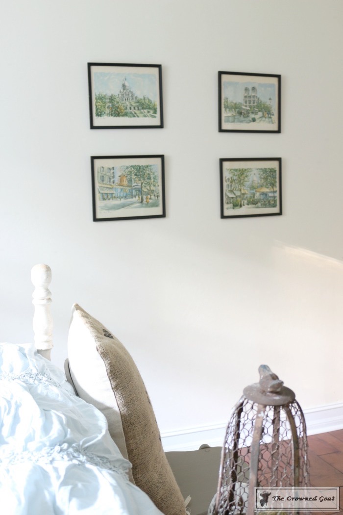 The bed is a family heirloom. I painted the buffet we’re using as a dresser. All of the vintage European inspired artwork and accessories were picked up at antique malls and thrift shops.