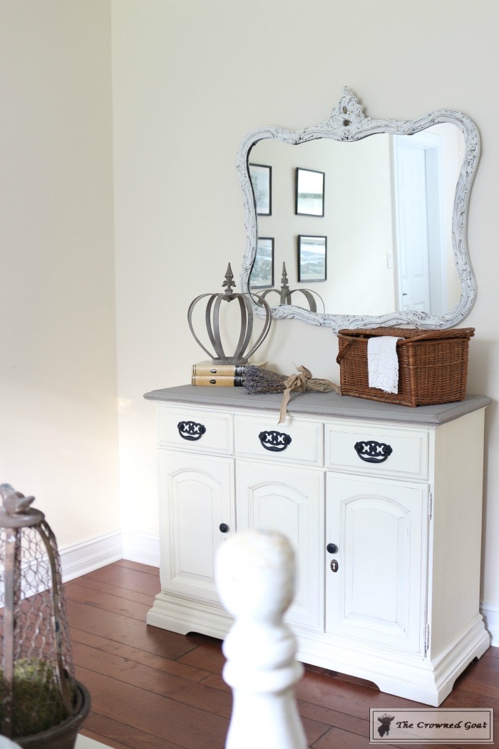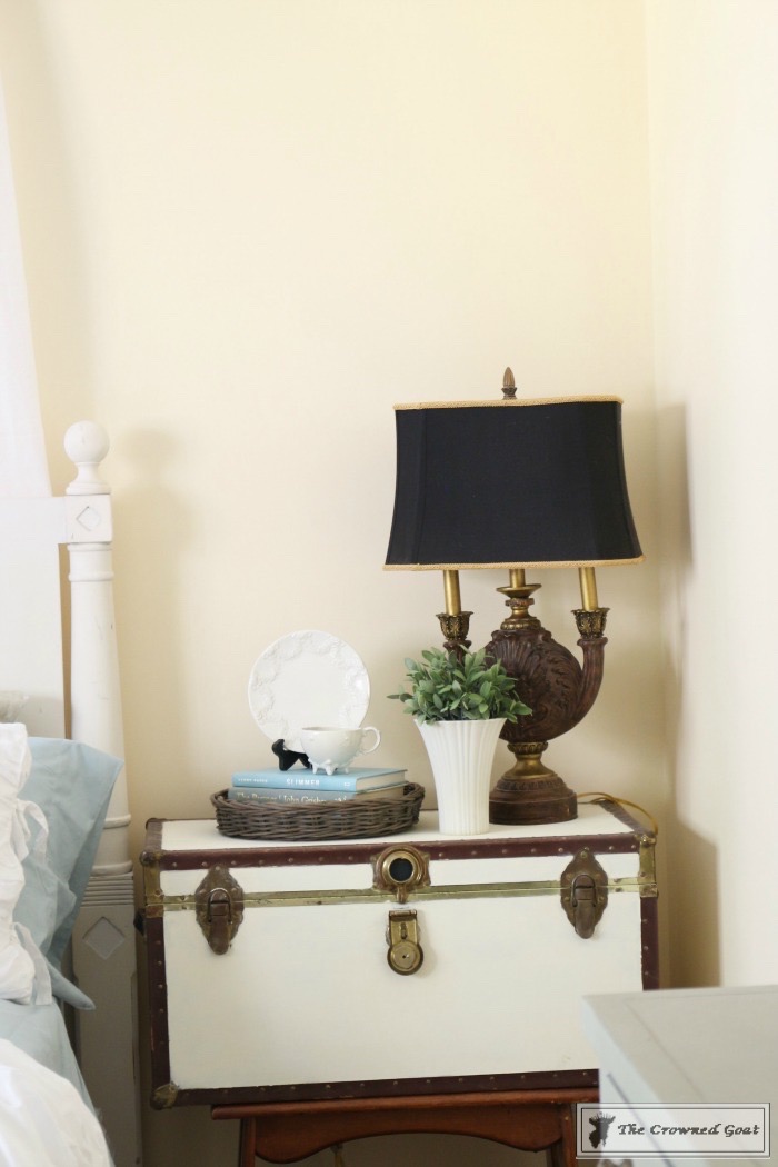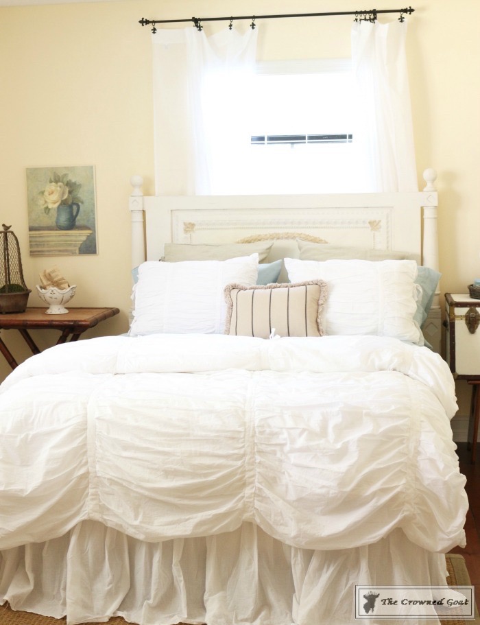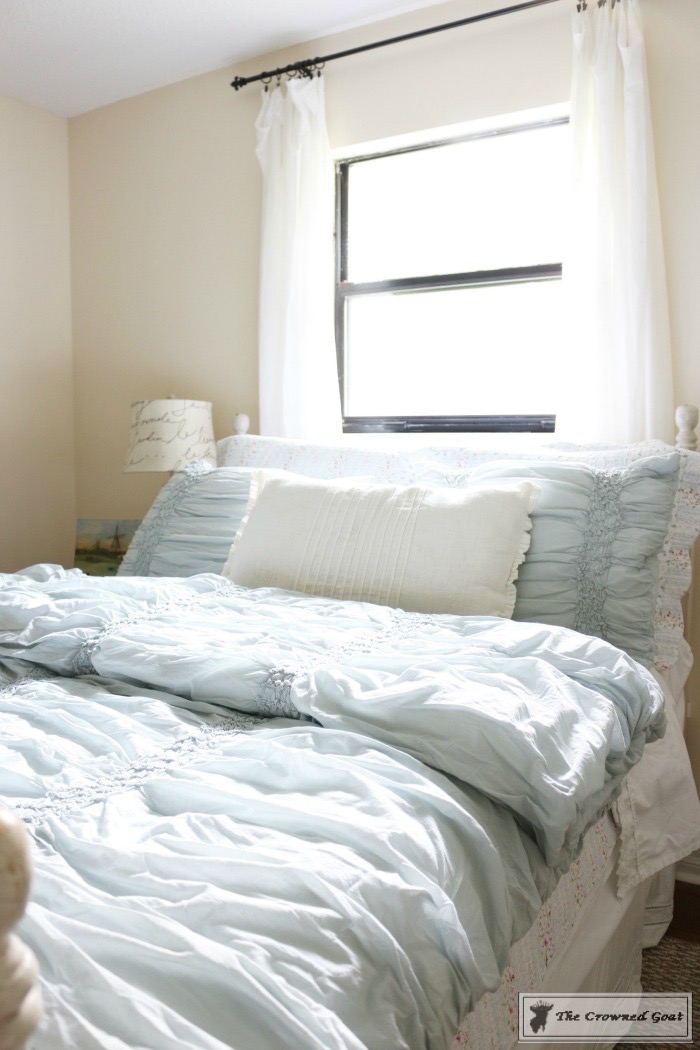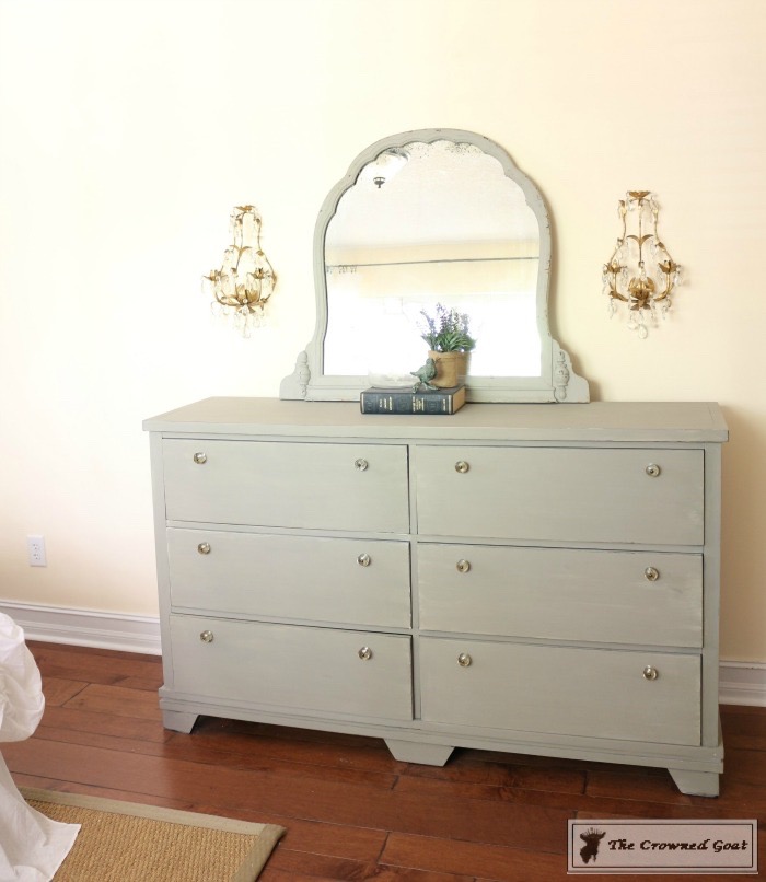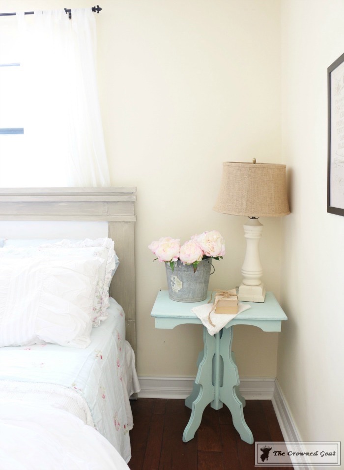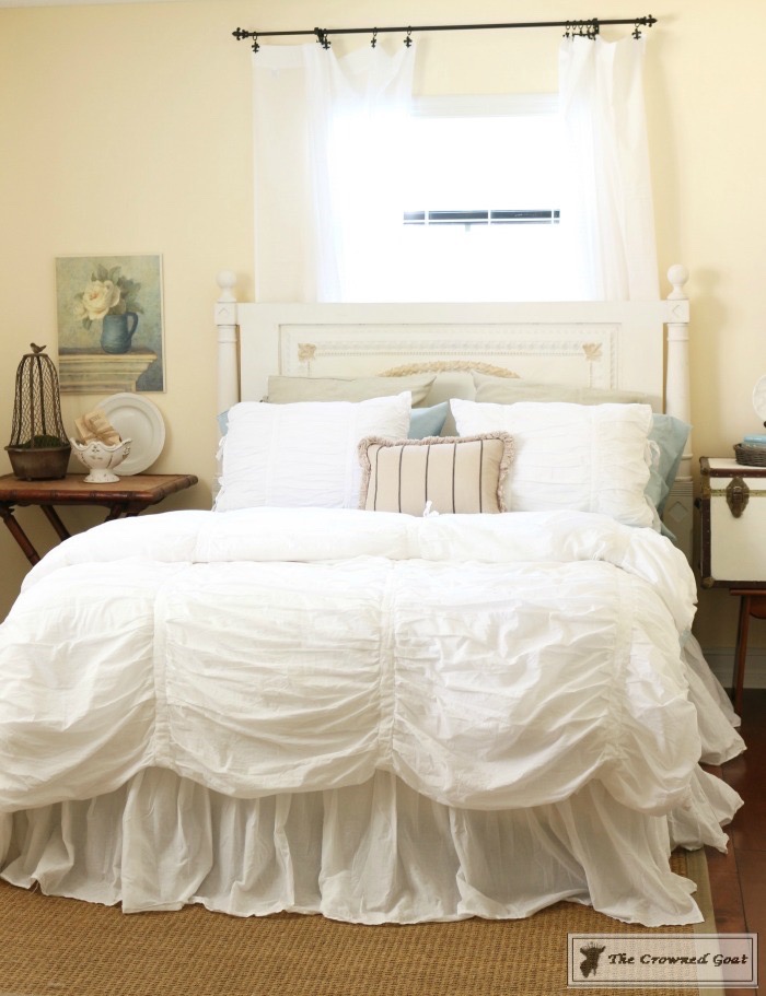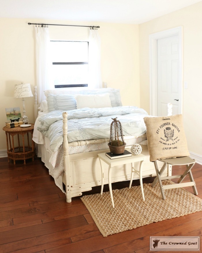 The bed is a family heirloom. I painted the buffet we’re using as a dresser. All of the vintage European inspired artwork and accessories were picked up at antique malls and thrift shops.