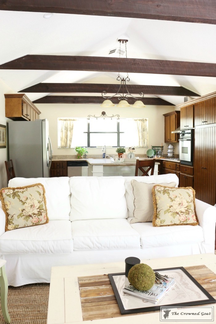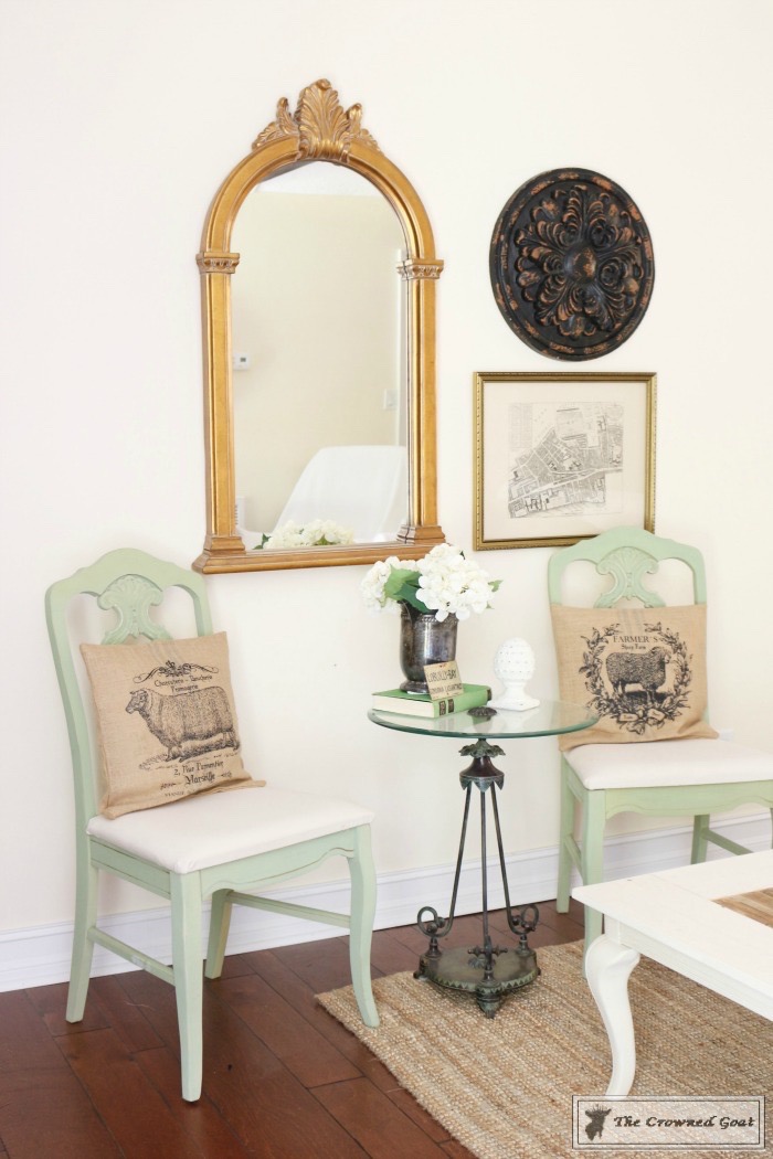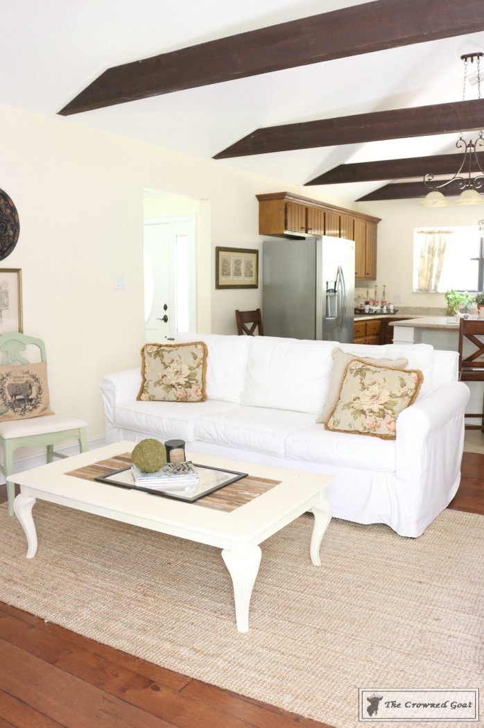 The accent chairs were painted with Miss Mustard Seed Milk Paint. The Loblolly Bay sign was found at Renninger’s in Mount Dora. The white slipcovered couch was purchased from Pottery Barn. We made the coffee table from reclaimed wood found on my grandpa’s property.