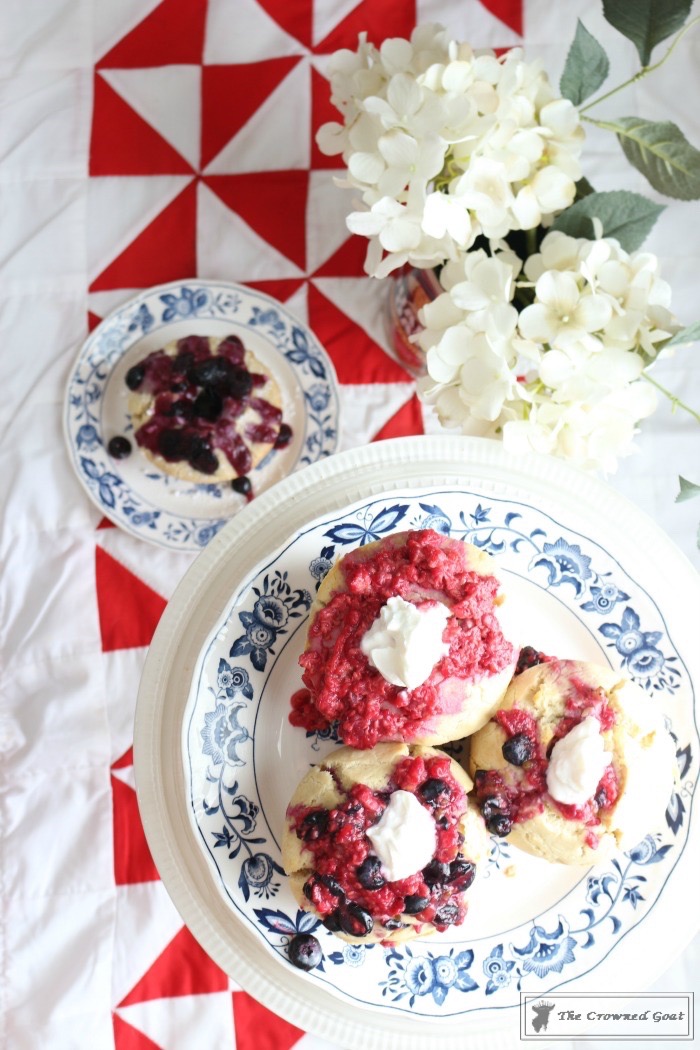 For a patriotic touch, you may want to also try raspberries, cherries or strawberries and place on blue and white plates or cake stands. You can find out how to make your own milk glass inspired cake stands here. We use these all the time!