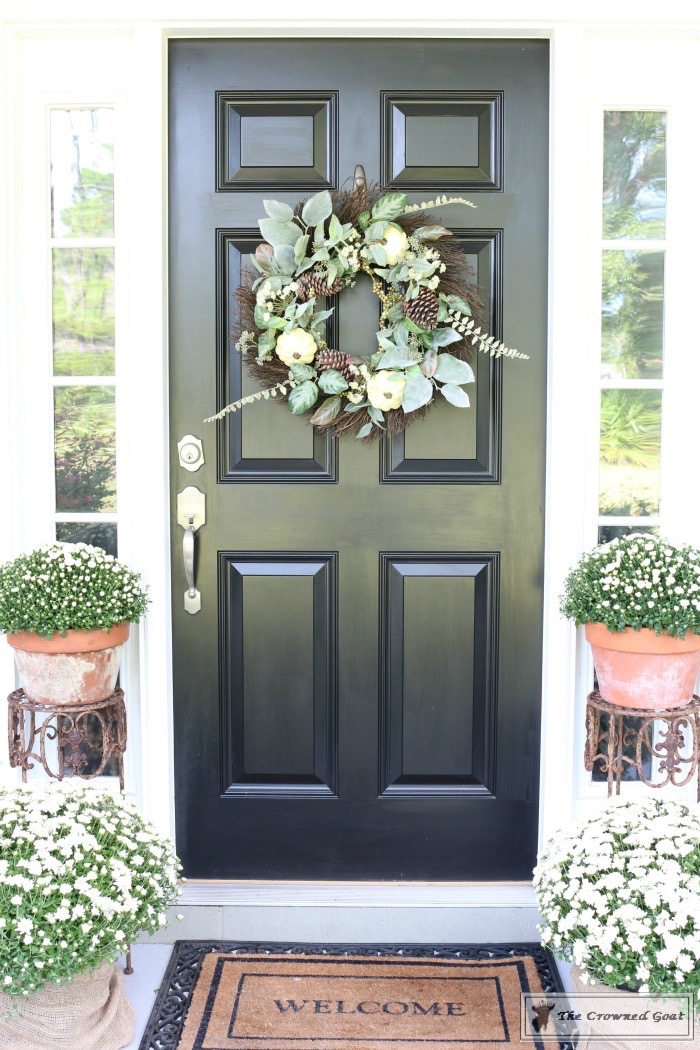 We still have plans to update a few things on the back patio which gets even more sun than the front porch so I can’t wait to try Front Door Paint on that door as well. I spent most of last week working to add a few fall touches to the front porch so I’ll share those with you tomorrow. Here’s a sneak peek at how the front door came together…