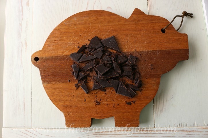 Chop approximately 5 squares of quality unsweetened baking chocolate into small pieces. This one is 85% Cacao.