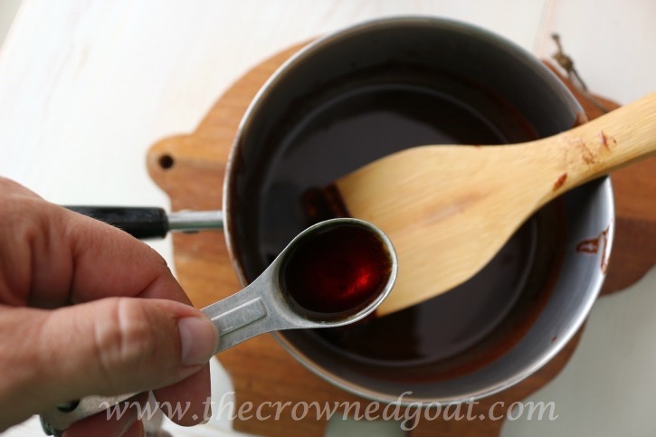 Place in a pot over low heat and stir until melted. Add ½ cup of unsalted butter and melt butter and chocolate together. Remove from heat and allow to cool approximately 10 minutes.