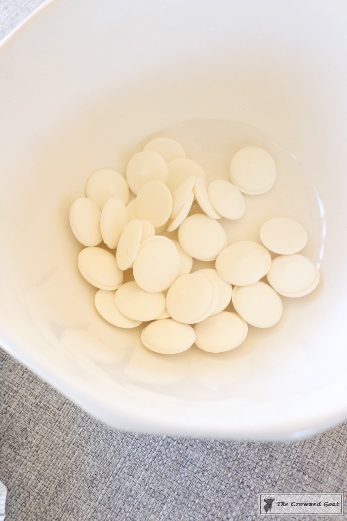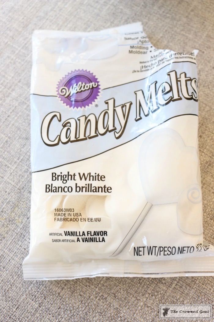 You’ll need to pick up some melting chocolates at the store. We bought this white chocolate melts at Hobby Lobby in the cake decorating section.