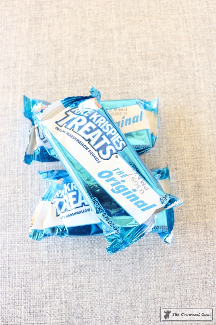 While the chocolate is melting, gather other supplies. You need marshmallows rice cereal treats (we used these Rice Krispies Treats which are individually wrapped and you can find at your local grocery store),