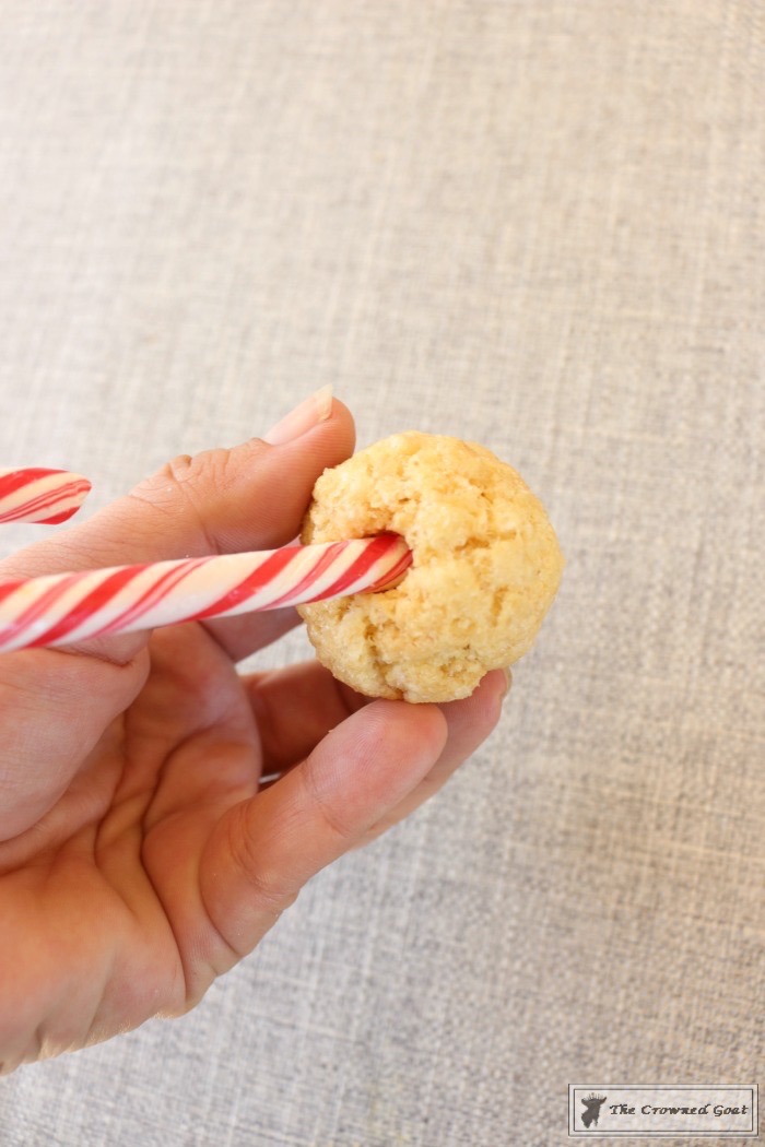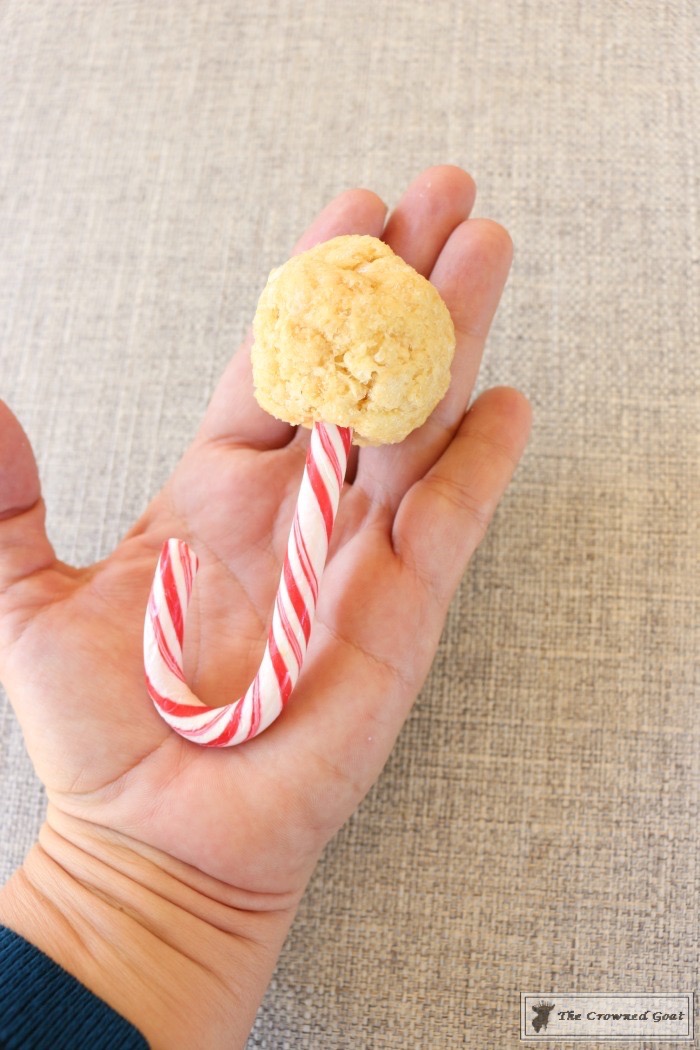 then carefully put the flat edge of the candy cane into the ball.