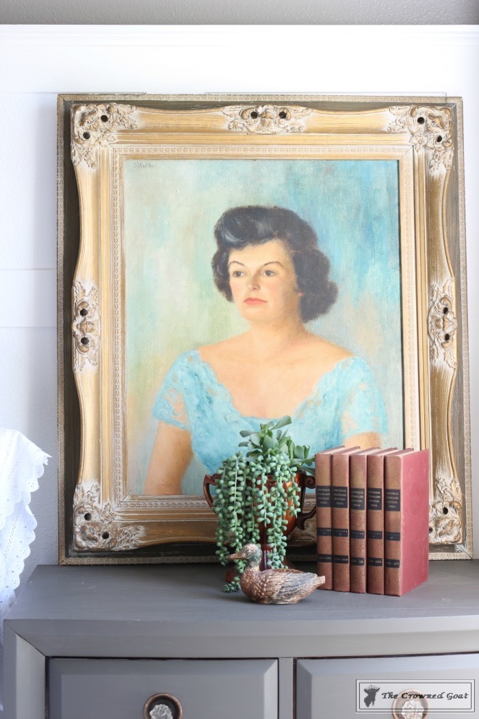 The artwork we originally chose didn’t arrive with enough to time have it framed so the, “lady of the house” is on loan from another room for right now. The books and trophy style cup are all thrifted and the duck is an heirloom pipe holder.