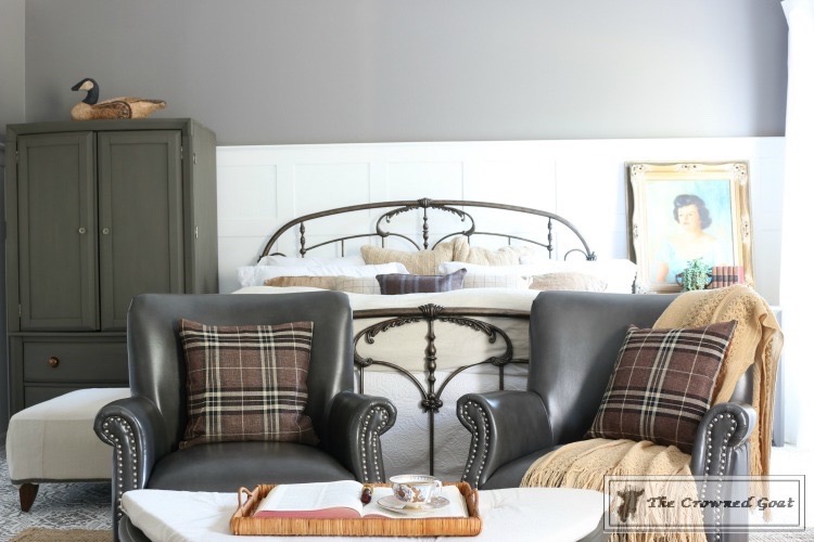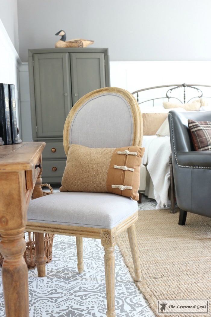 I am in love with the board and batten and the stenciled floor. This really makes your room more than just an accessorized version of what it was before (and I see this in a lot of makeovers). The cabinet and nightstand are fabulous and the bed linens work perfectly. I’d love to dive into that bed at night or curl up in one of those comfy chairs. Great job!! Enjoy!