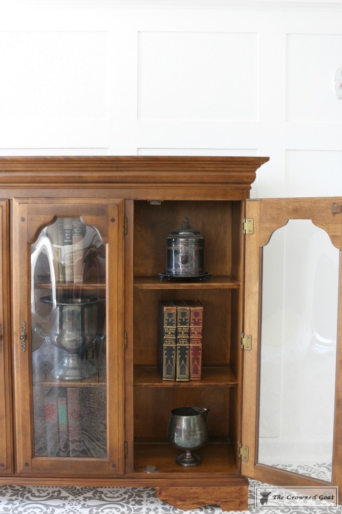 We found the “library hutch” at an estate sale for $12 last year. It’s probably part of a china hutch/buffet combo which I thought we would use in the office makeover but we needed something that would be streamlined and hold the TV. S built the “feet” so it looks like an intentional piece of furniture now. I’ll share it in more detail with you next week.