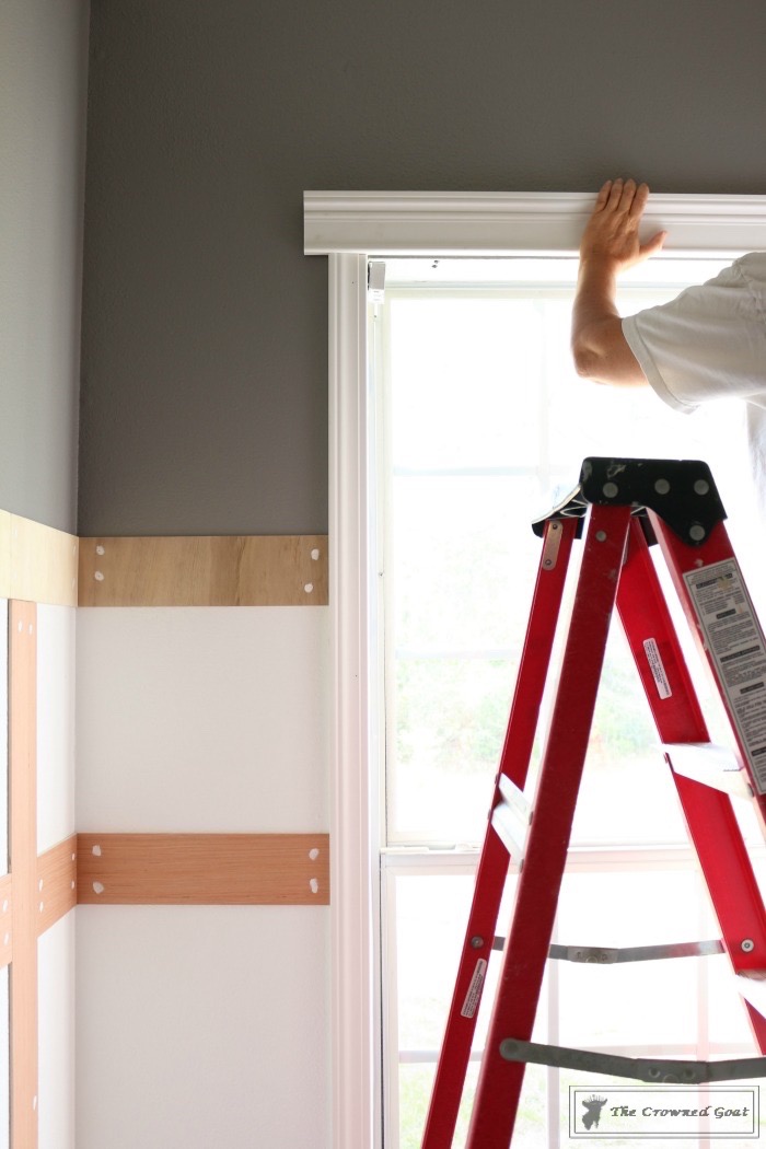 We painted the walls in Valspar’s Cathedral Stone on the top and Ultra White on the bottom then we installed board and batten.
