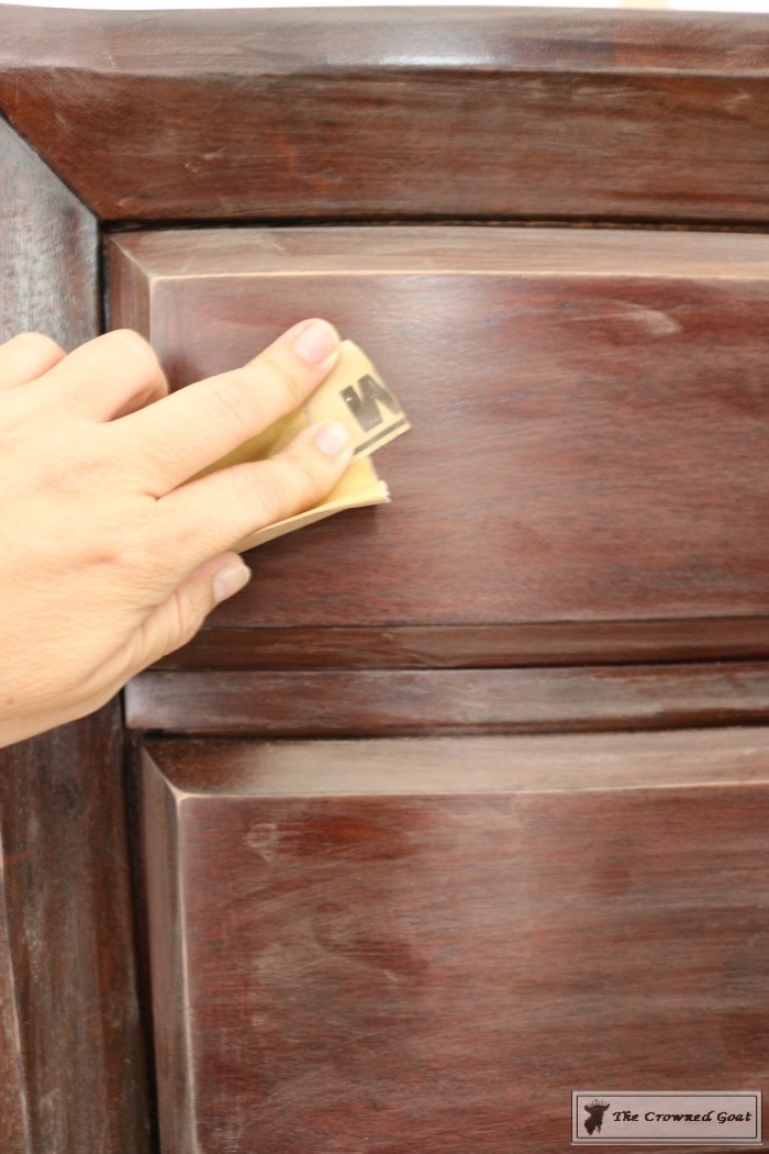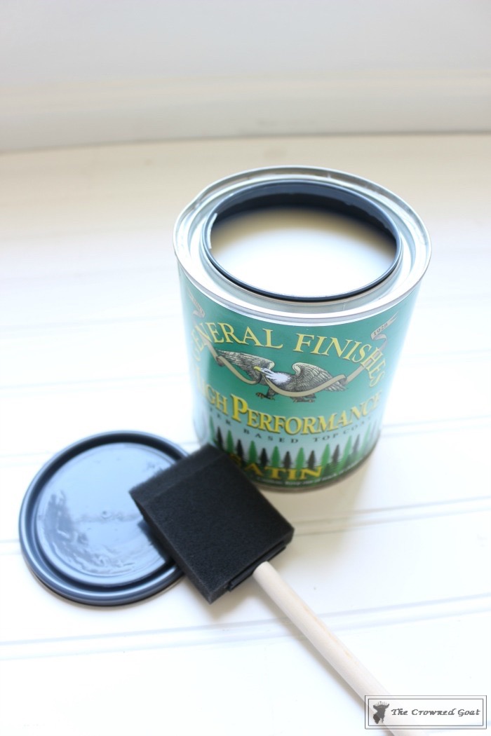 I let the piece dry overnight before applying several coats of General Finishes Water Based High Performance Top Coat, sanding between coats with a 320-grit sandpaper, removing sanding dust before applying another coat and allowing 2 hours between each coat. Don’t let this milky white color scare you, this top coat goes on clear and dries very quickly.