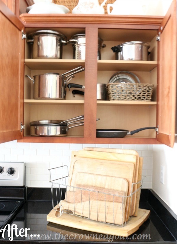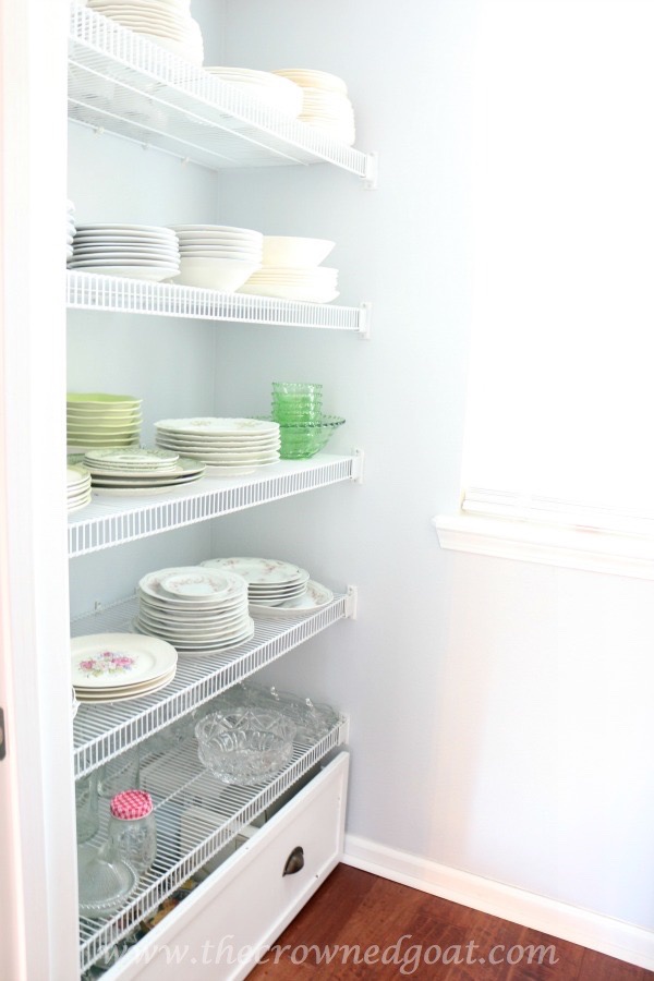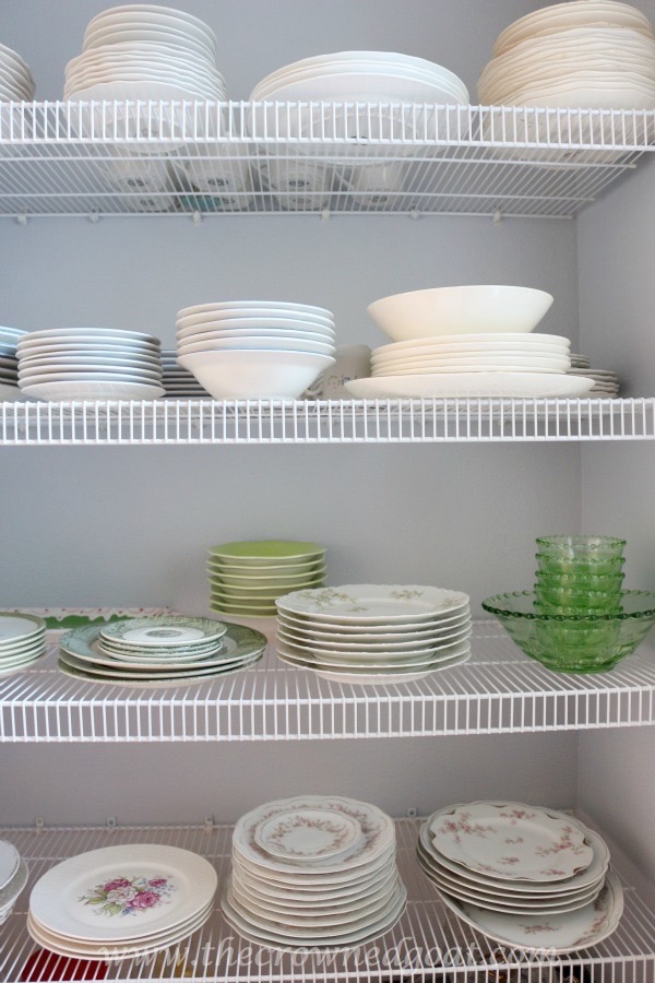 After the shelves were secure and in place, it was time to start organizing all of the dishes which I chose to arrange by color.