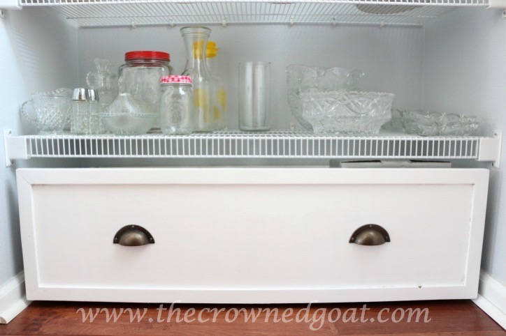 We hatched an idea to organize the party supplies in a drawer we built with plywood, a nail gun, trim, casters, white paint and hardware from Hobby Lobby. We built two – one for each side. I’ll share more about how we built the drawers next week.