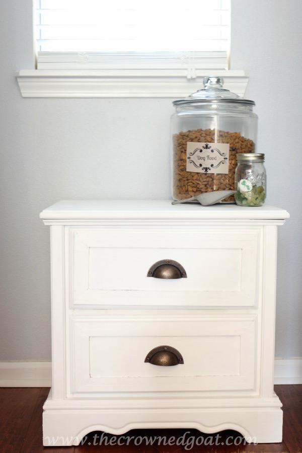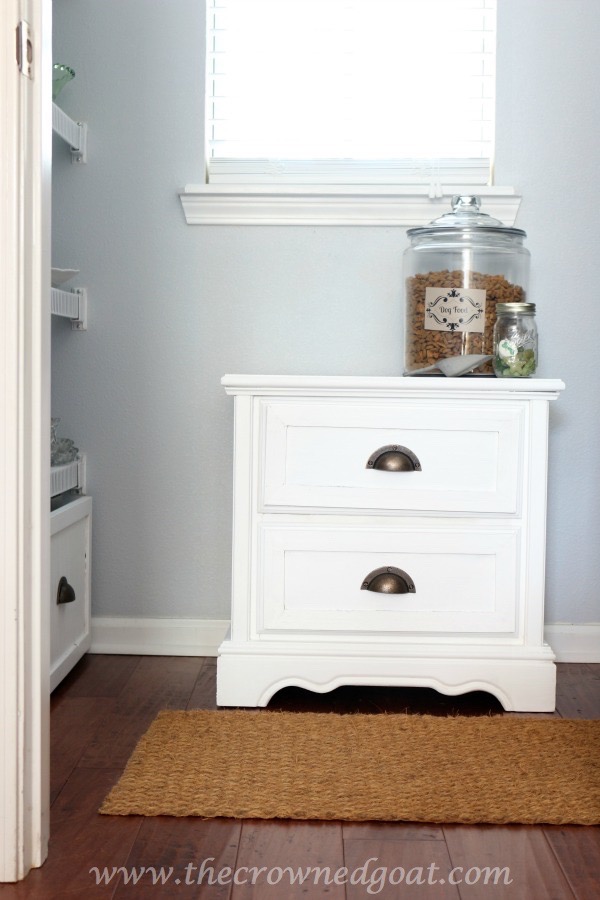 Then I thought about how the dogs needed a place for their treats and toys. This nightstand was part of the bedroom set my parents bought me when I was 2. It’s been hanging out in the garage for almost 6 years. It got a total facelift, which I’ll share with you in February. Talk about perfect fit. Now we also have a dog feeding station and toy storage in the pantry too.