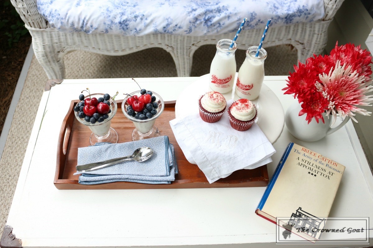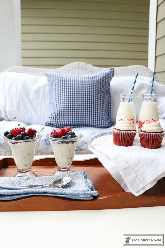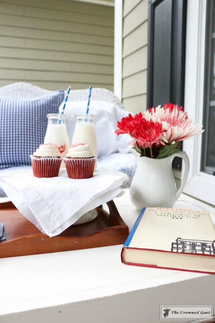 I’ll share more about the wicker couch and old trunk with you later this week. They’ve both been given a little makeover. You can’t have a patriotic summer porch in the South without adding red velvet cupcakes. I’ve yet to meet a sweet old lady that didn’t have her own secret recipe. That cream cheese frosting is just so good.