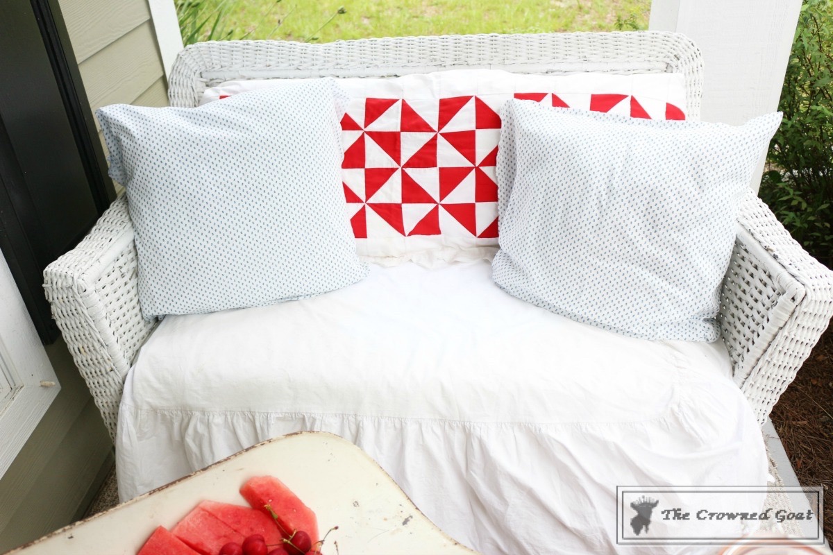 I also bought this wicker settee in Mount Dora. It’s holding up pretty well for a vintage piece. The red and white pillow cover was made from a quilt scrap I picked up at a thrift store.