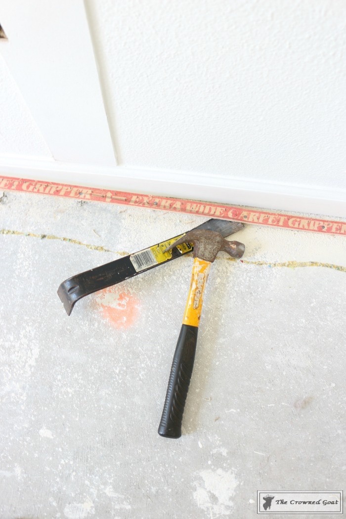 After you get all of the carpet and padding out of the room, you have to remove the carpet tack strips and let me just tell you, they are really sharp so using caution and care is a must. We used the Wonder Bar by Stanley and a hammer to take up the carpet tack strips. Goodness gracious, you guys, this part takes a while. We had a construction trash bag at the ready so we could place the tack strips and nails directly into the bag. You’ll definitely want to keep children and pets out of this area while you’re working.