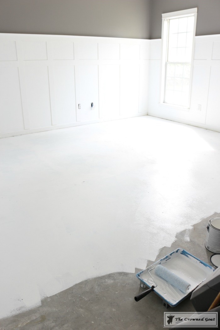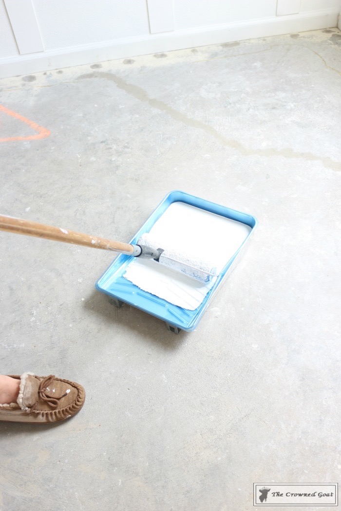 Saturday morning, we started painting the floor in Valspar’s Porch and Floor Paint. We had it tinted and matched to Ultra White which is the same color we painted the board and batten.