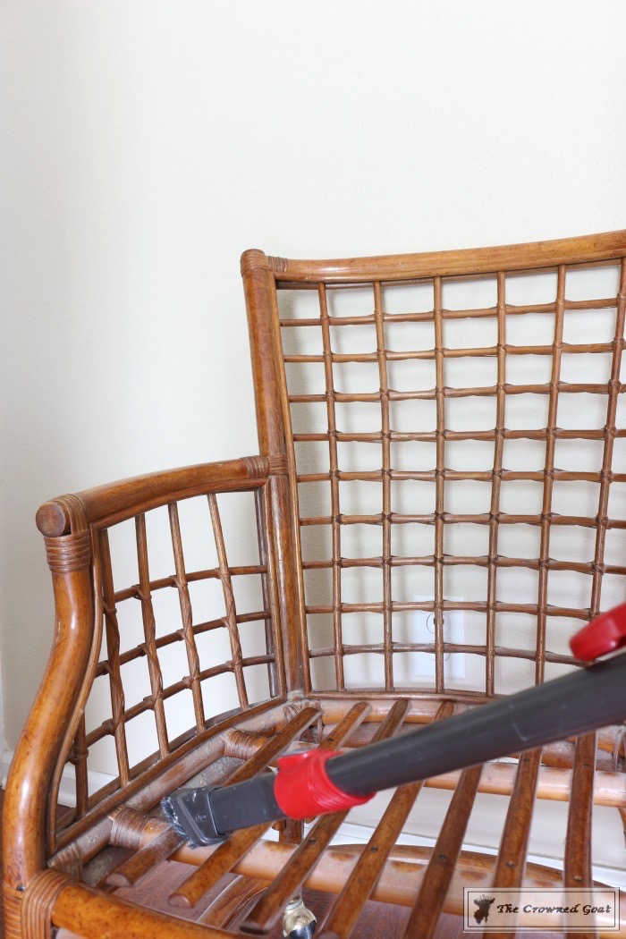 …and it desperately needed cleaning. Cleaning wicker or rattan is fairly easy in that you don’t want to completely soak the reeds or fibers with water and chemicals. The first step of the process is making sure you’re eyes/nose/mouth/face are all protected with a mask and safety goggles to keep out the dust, dirt and debris particles.