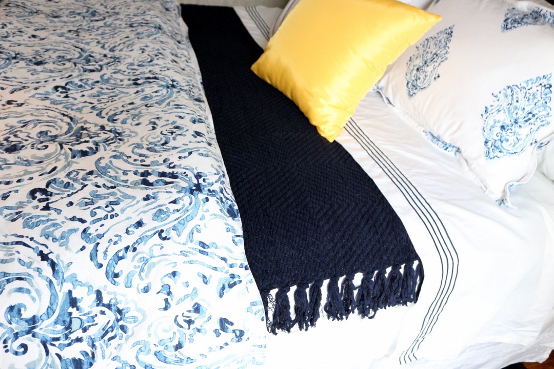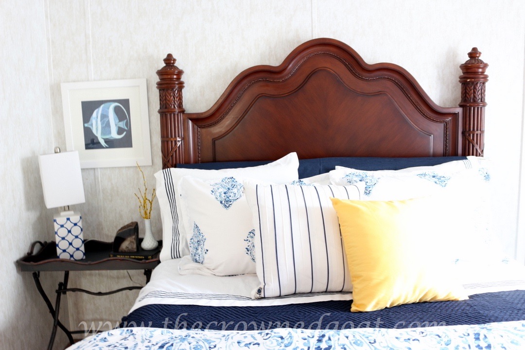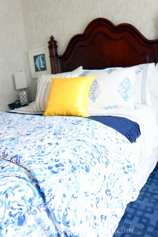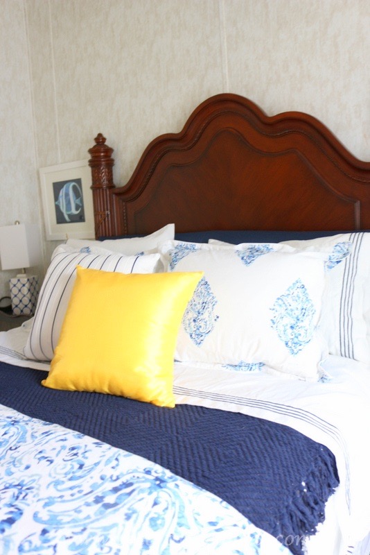 The homeowner chose a mix of crisp whites, navy blues and pops of yellow. She wanted the headboard and bed linens to make a statement in each room, which I’m excited to say we accomplished.