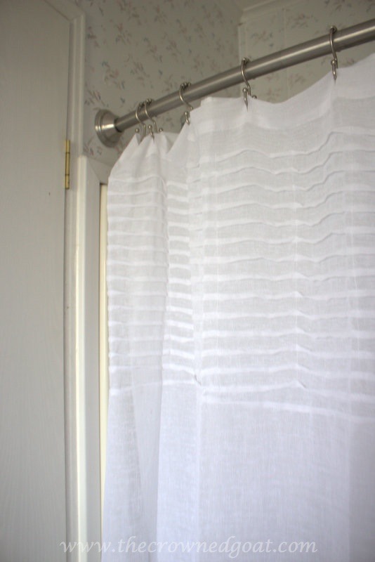 We replaced the straight curtain rod with an arched one to allow more room while in the shower and added a gauzy white shower curtain with these sweet pleats.