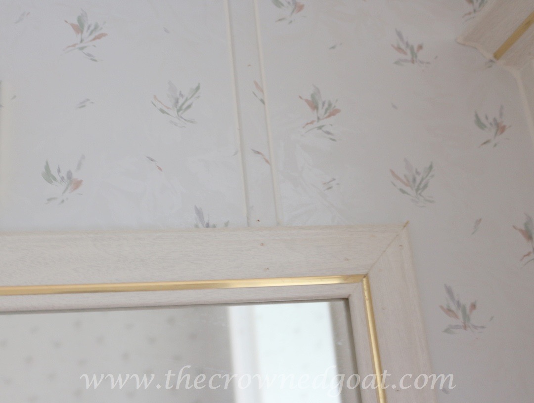 The trim around the mirror was framed with sort of a white washed wood look and accented with a gold stripe.