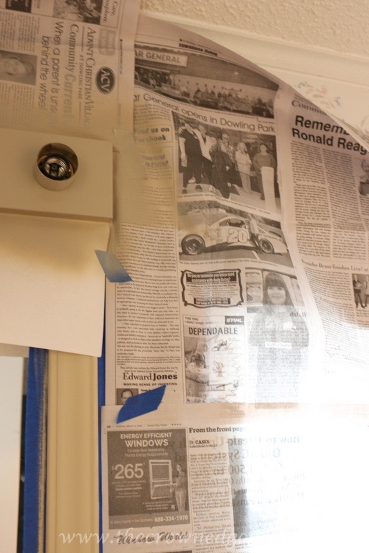 We added garbage bags, newspaper, drop cloths and everything else we could think of to protect the rest of the bathroom. Since the mirror was painted in Country Grey, I found a similar spray paint color by Rust Oleum called Putty to paint the base so the colors would complement each other without being an exact match.
