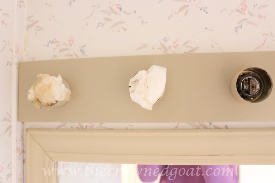 After the coats of wax were dried, we decided to address the light fixture. The homeowner wanted to keep the streamlined look of the vanity lights but she didn’t particularly like the gold color or the bulbs. So, she asked me to spray paint the base of the fixture. I know. I’ve never spray painted anything indoors in my life.