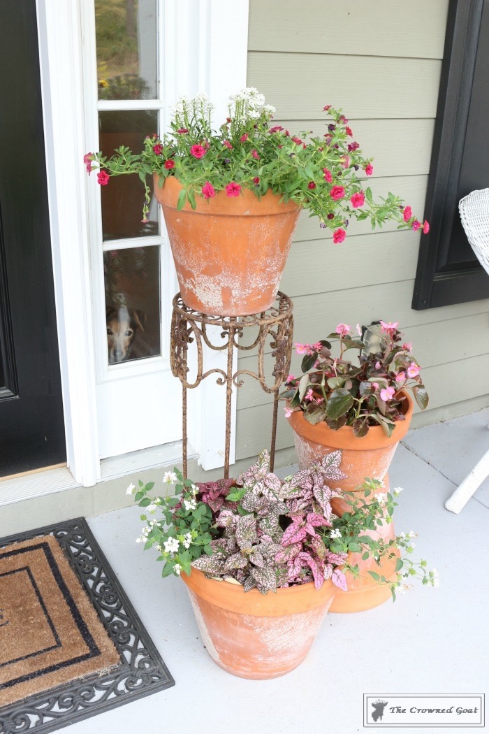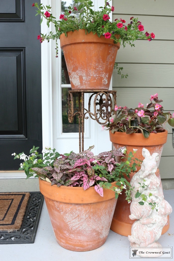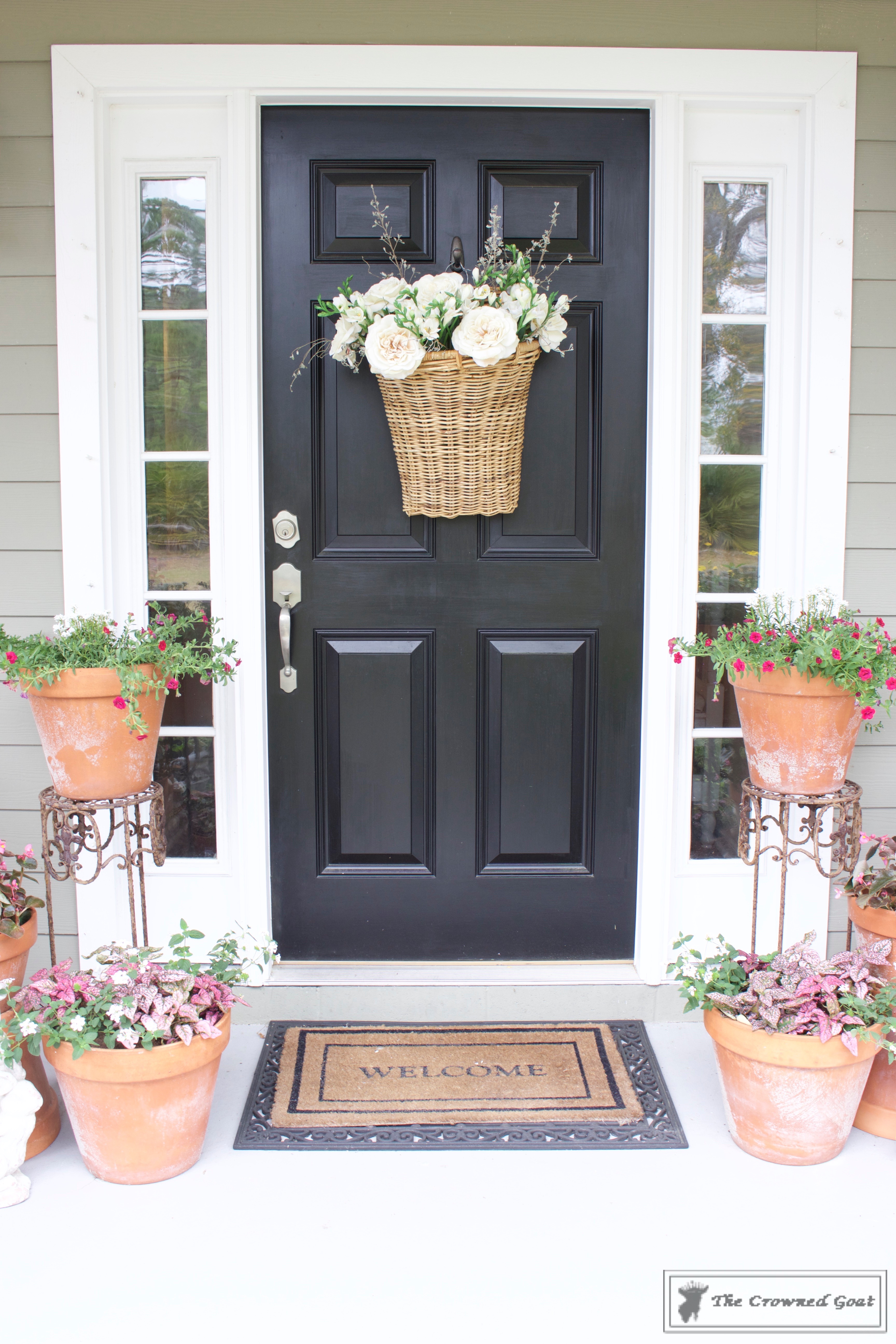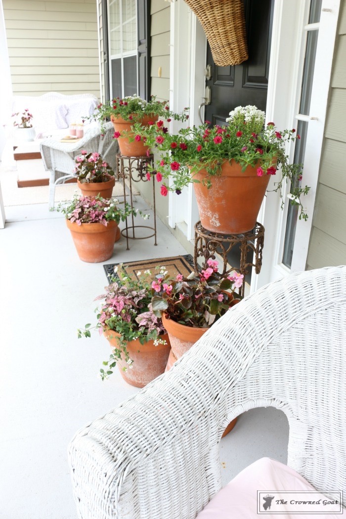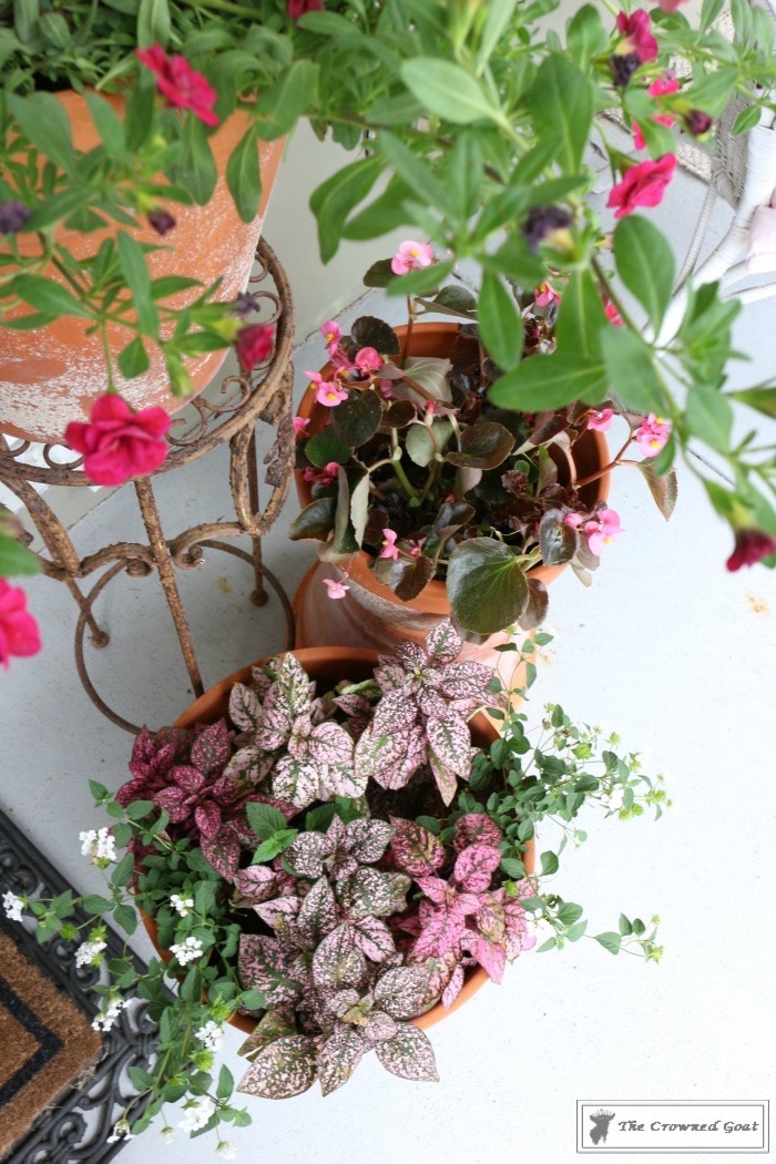Since the flowers in the front door flower basket are pretty neutral, we decided to add a little bit of color to flank the sides of the door and welcome mat. These terra cotta pots are fairly large so we needed pretty flowers that would also be budget friendly.