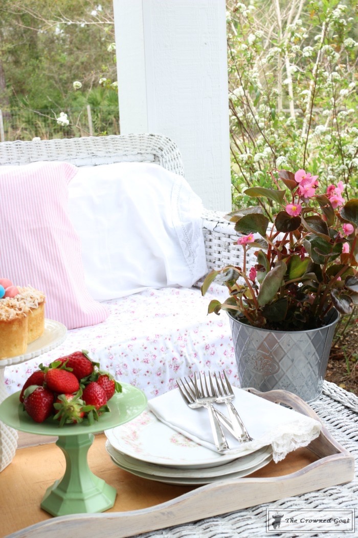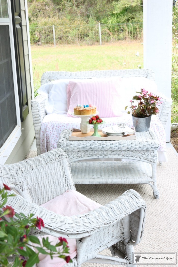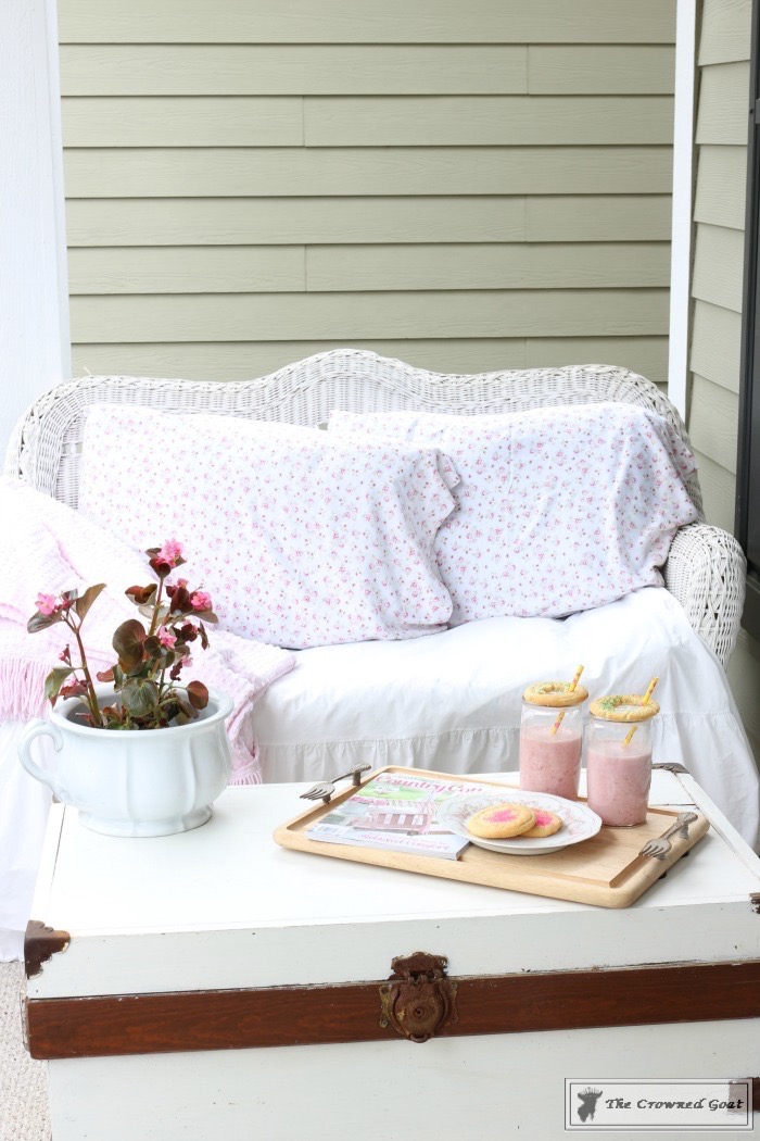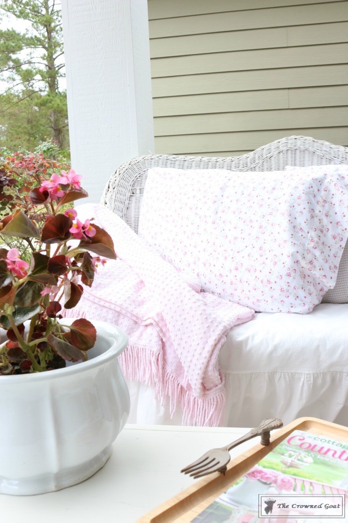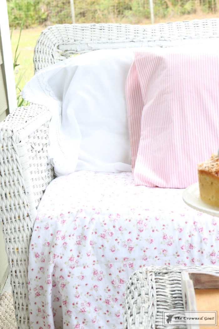 I get a lot of questions about the linens we use on the porches, especially in the summer when it rains nearly every day and the heat is “hotter than a pepper patch.” Most of the time the linens are thrifted and can be thrown in the washing machine without any fuss.