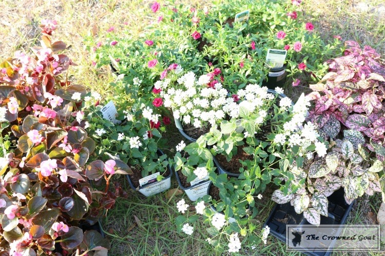 and on the bottom we mixed two different colors of “Polka Dot Plants” (the pink and green ones which cost about $1.15 each) and “White Lantana” (which costs about $2.98 each). Lantana is very hardy and comes in so many pretty colors. That being said, it’s not good for pets if ingested so make sure you use caution and care if you have curious animals. We have lantana growing in a few different places around the property because it attracts butterflies.