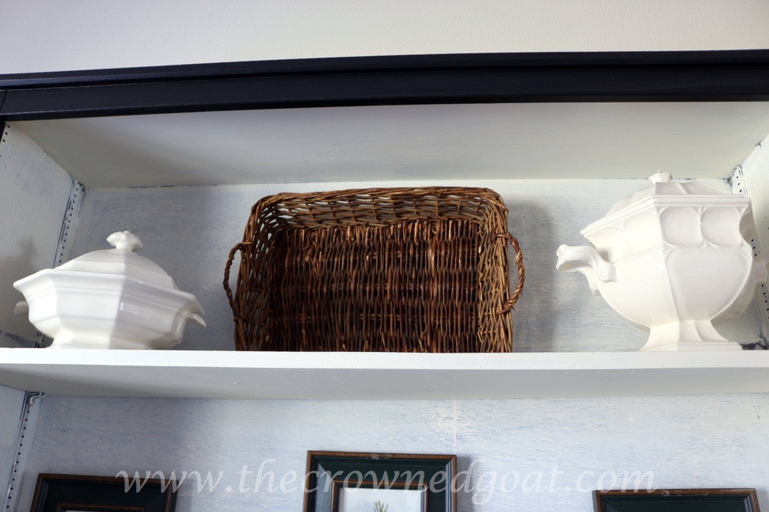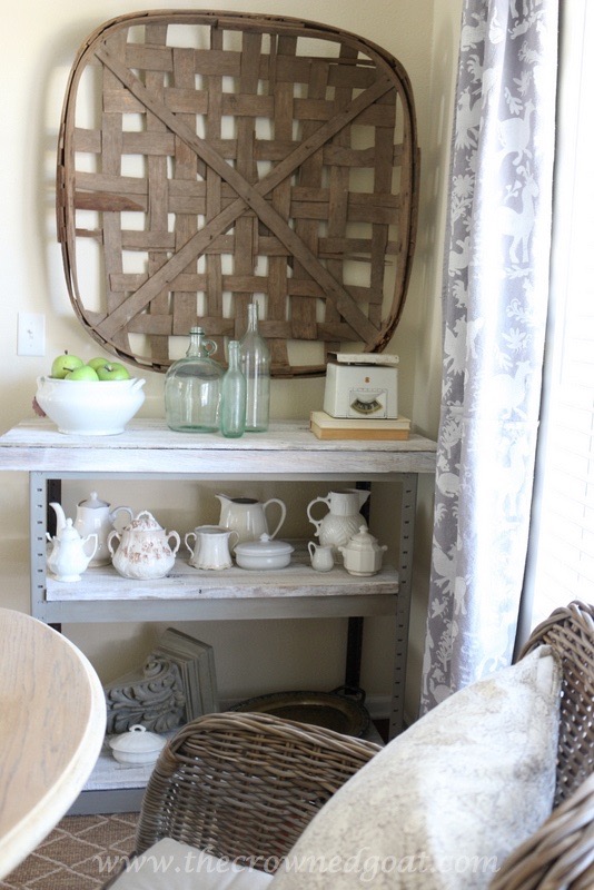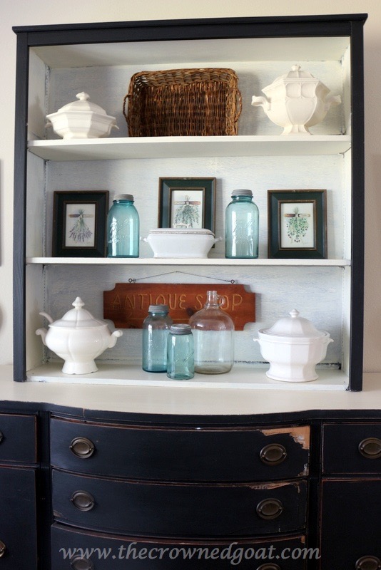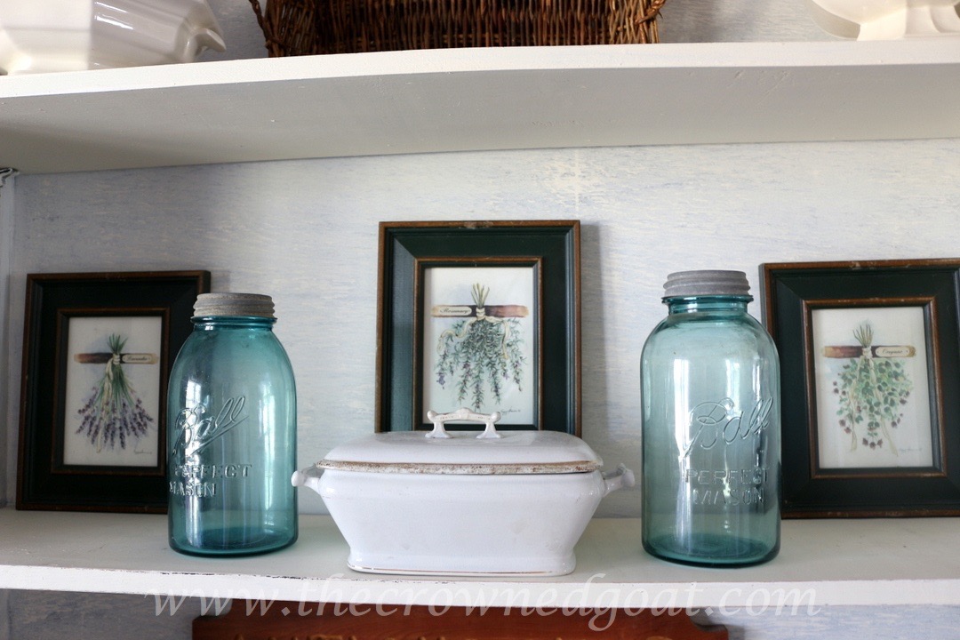Since I’m always bringing new items to sell at The Pickers Market, I shopped the house to change out the display on the hutch and buffet. You can find vintage aqua Ball jars and pieces of ironstone at local antique malls. I picked up these herb prints at a local charity shop a few months ago and have been waiting for Spring to use them.