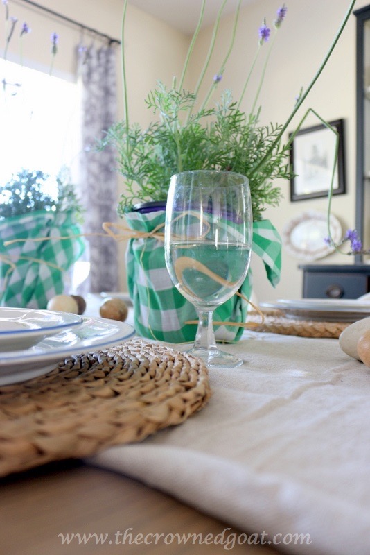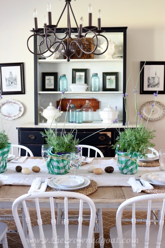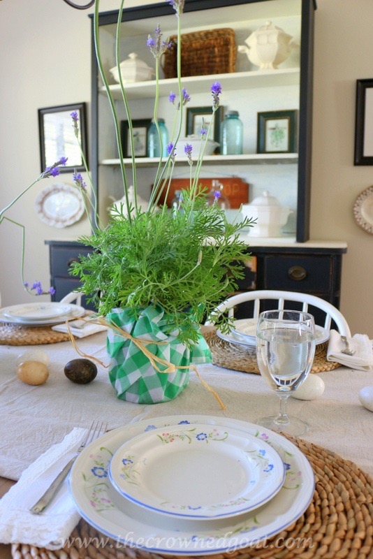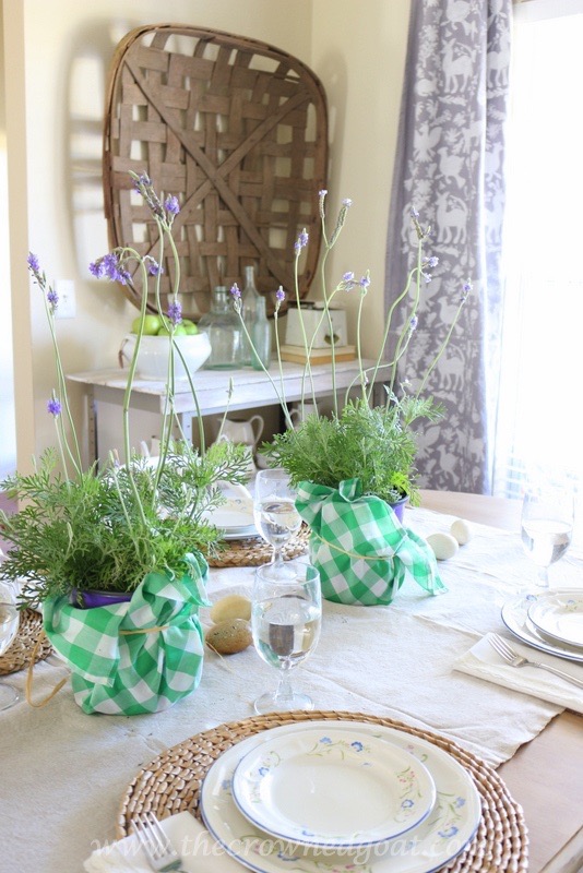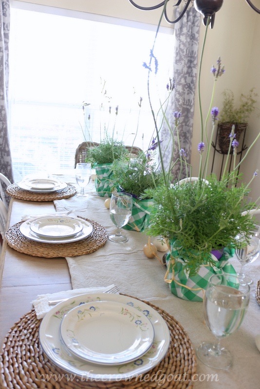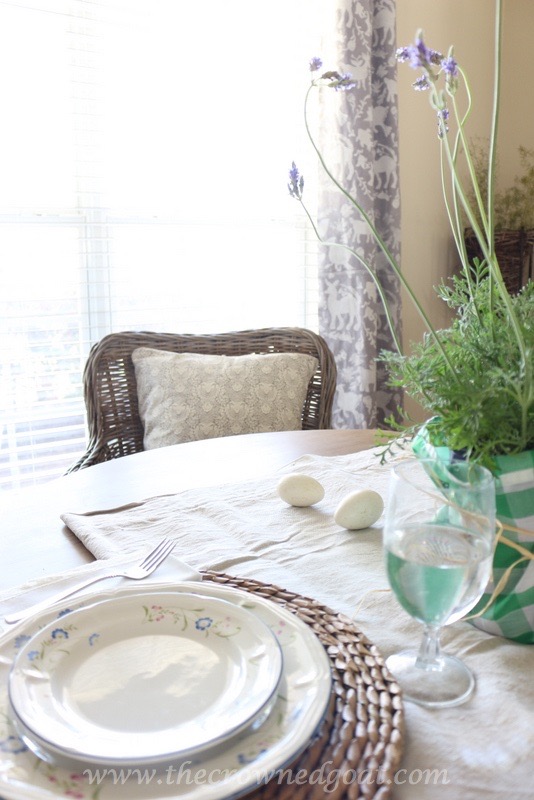 One easy way to create a Spring look in your dining room without spending a lot extra money on flower arrangements is to head to your local plant nursery or home improvement store for flowers, plants or herbs. We recently picked up these lavender plants and they smell so good. They’re kind of wild and whimsical (like my hair ha ha) and make for a “showy” display on the table.