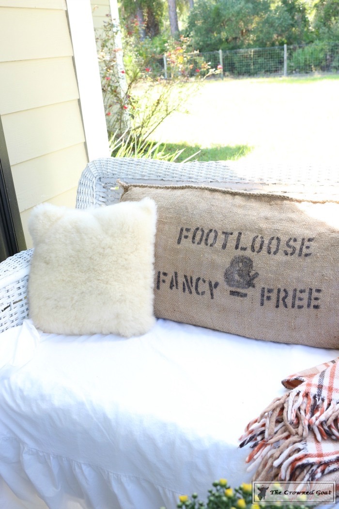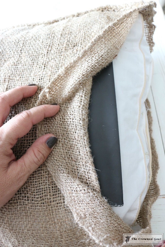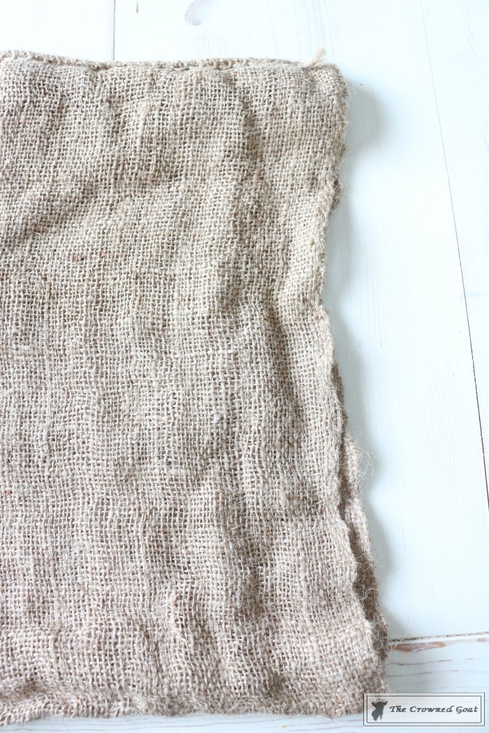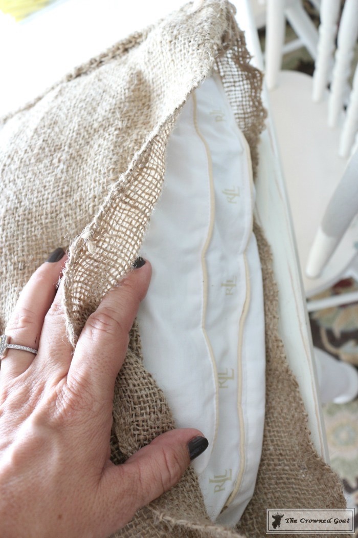 Firstly, slip a king size pillow into the burlap sack like you would a pillow case. Remember the pillows you use for the front porch don’t have to be super expensive or plush like you would use for your bed. These are a great deal for 2.