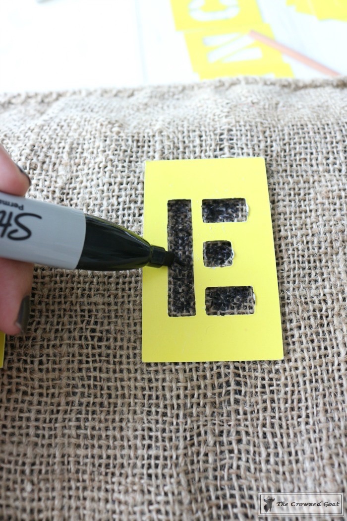 If you’re looking for a way to customize or personalize burlap feed sacks as pillow covers, consider using stencils and a permanent pen like a Sharpie or fabric paint pens. This project is so easy to complete it almost doesn’t need directions. But just in case you’re using a different kind of feed sack or pillowcase, we’re sharing the steps below.