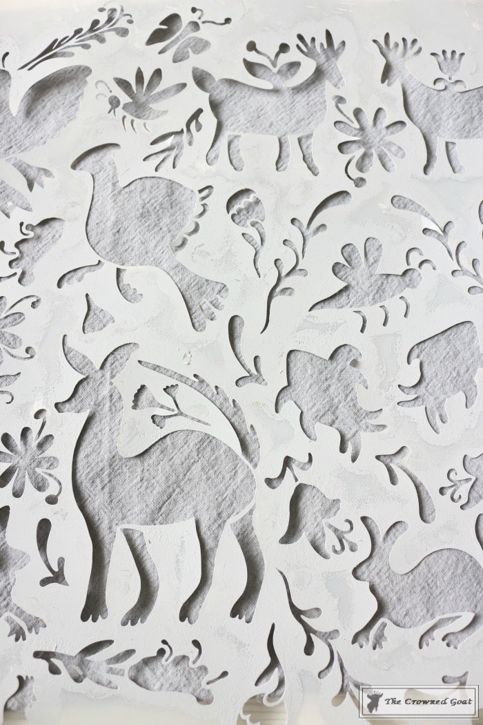 Use a stencil brush or roller to apply paint (I’m using Annie Sloan Chalk Paint in Pure White watered down just a bit) taking care to roll any excess paint off the brush or roller before applying it the stencil.