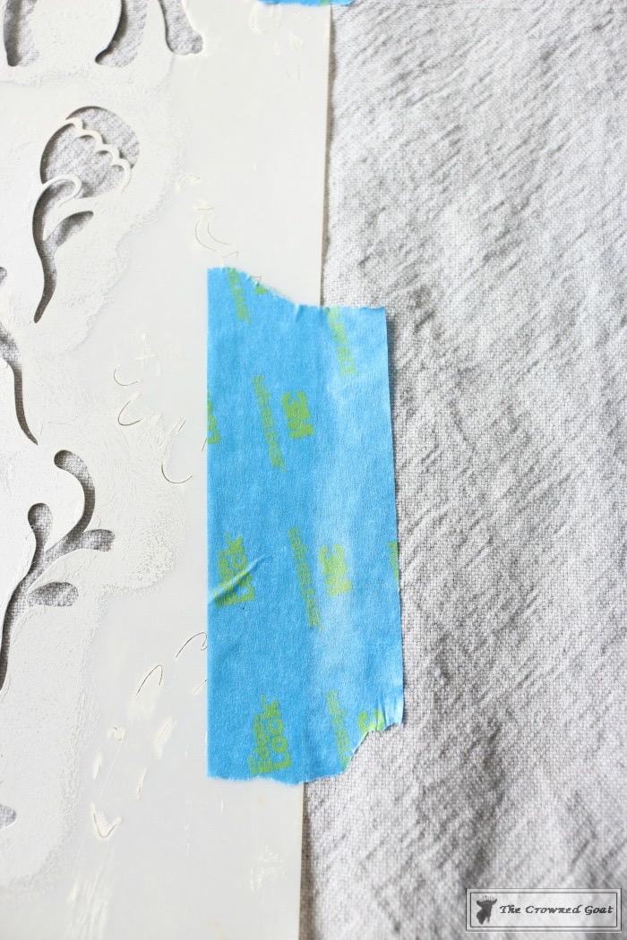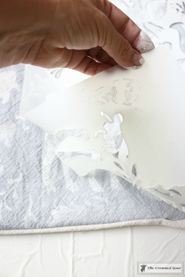 Once you’ve gotten the desired coverage, carefully lift the stencil off the pillow cover.