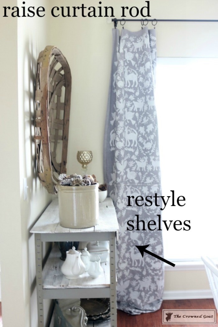 The only thing I would add in this room right now (eventually we want to add board and batten to the wall, a new rug and slipcovered seating) is to raise the curtain rod a little higher and to add larger artwork on either side of the hutch.