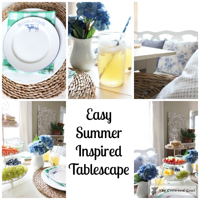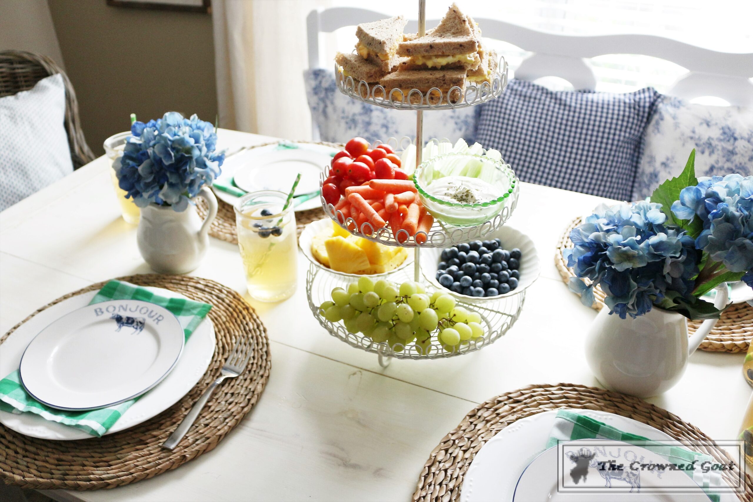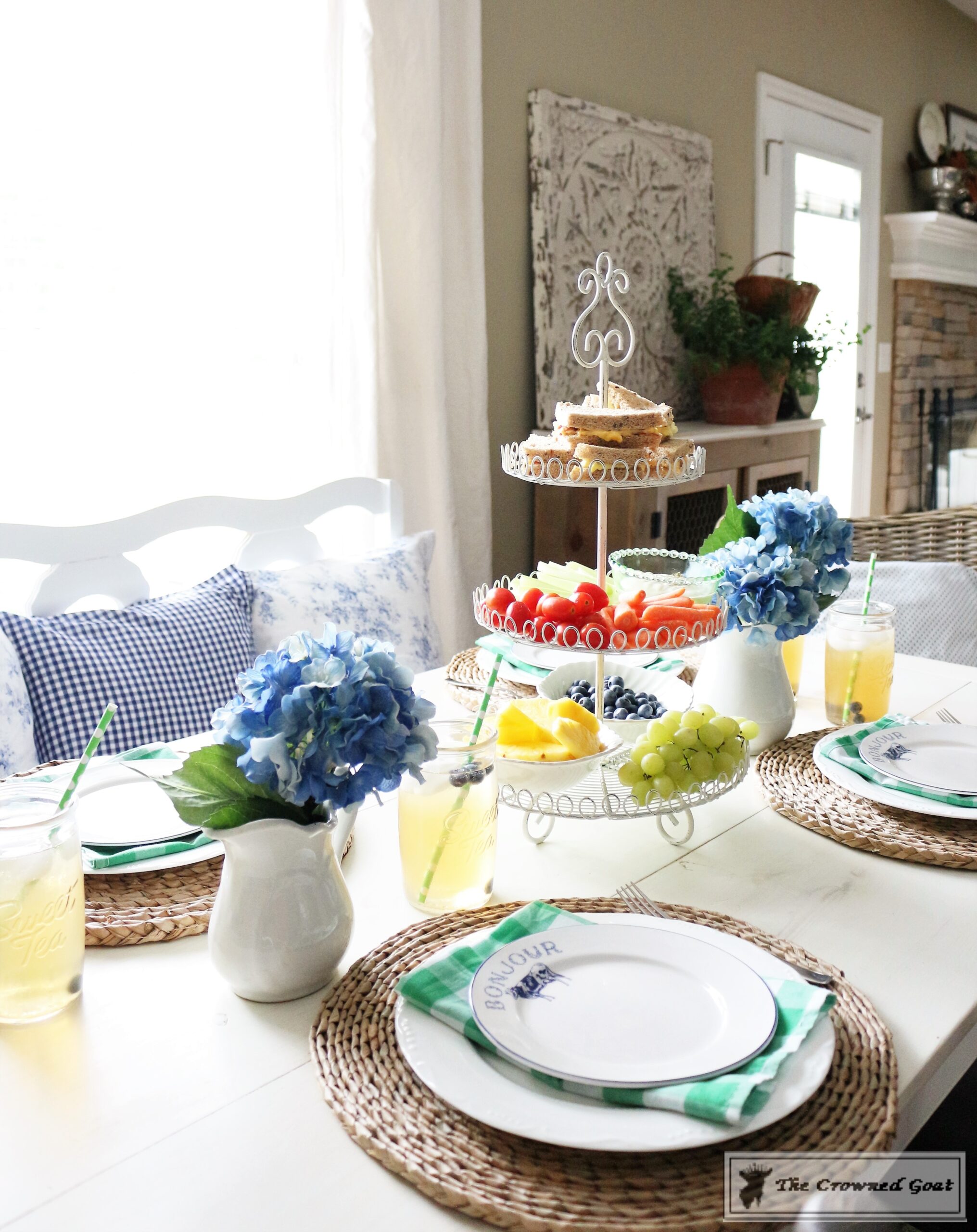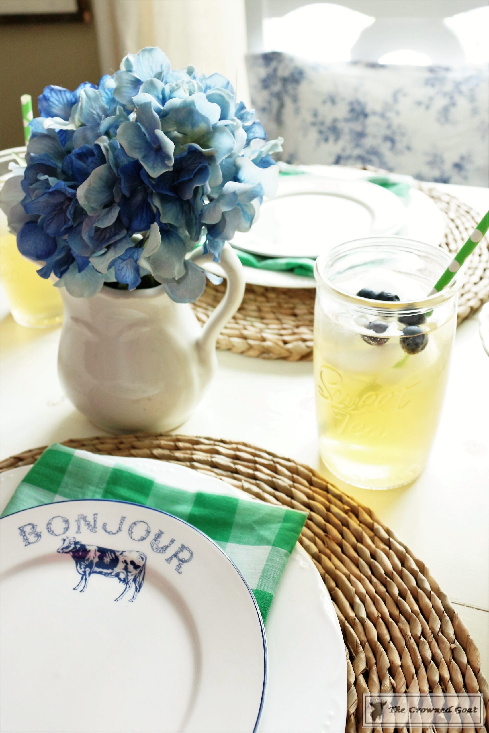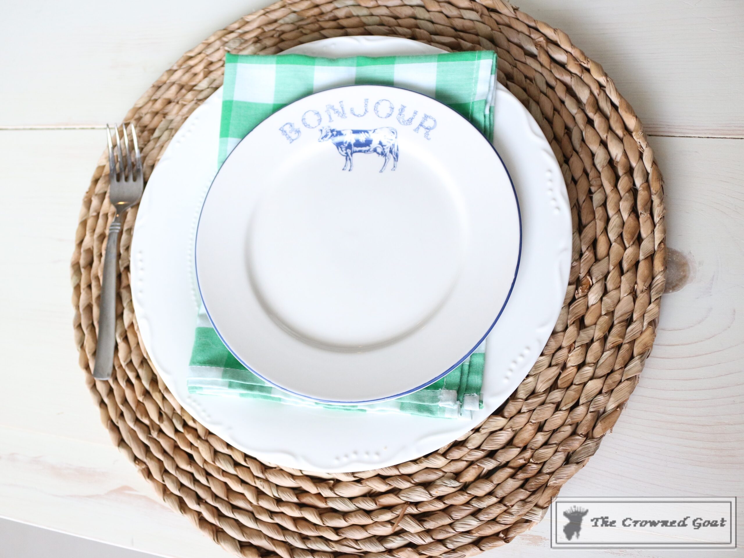 I brought out a relaxing mix of woven chargers, ironstone, green and white checked napkins and these Bonjour Blue Cow Salad Plates from Kirkland’s I received as a birthday gift this year. These colors all pair well together because they are so classic summertime.