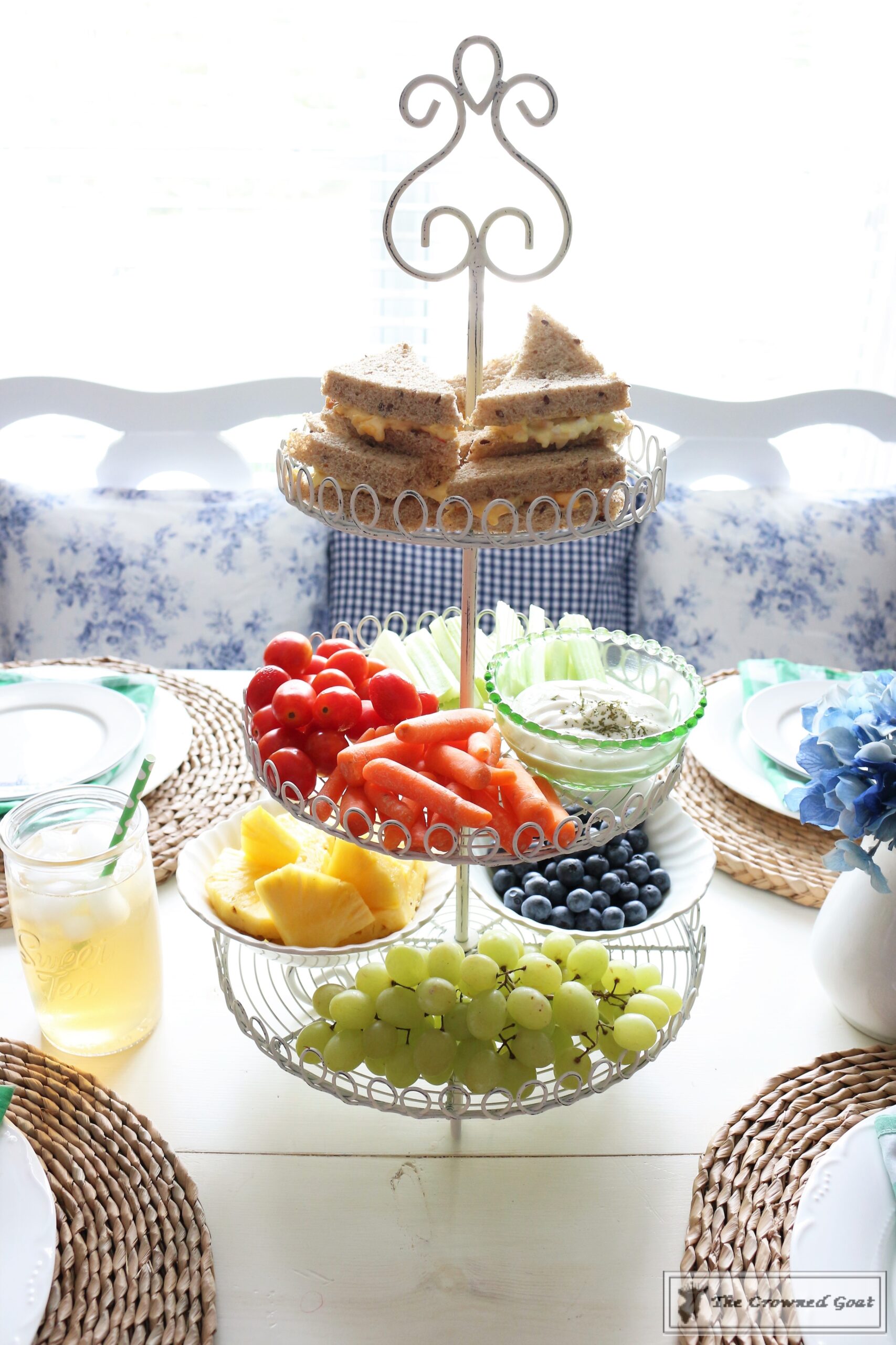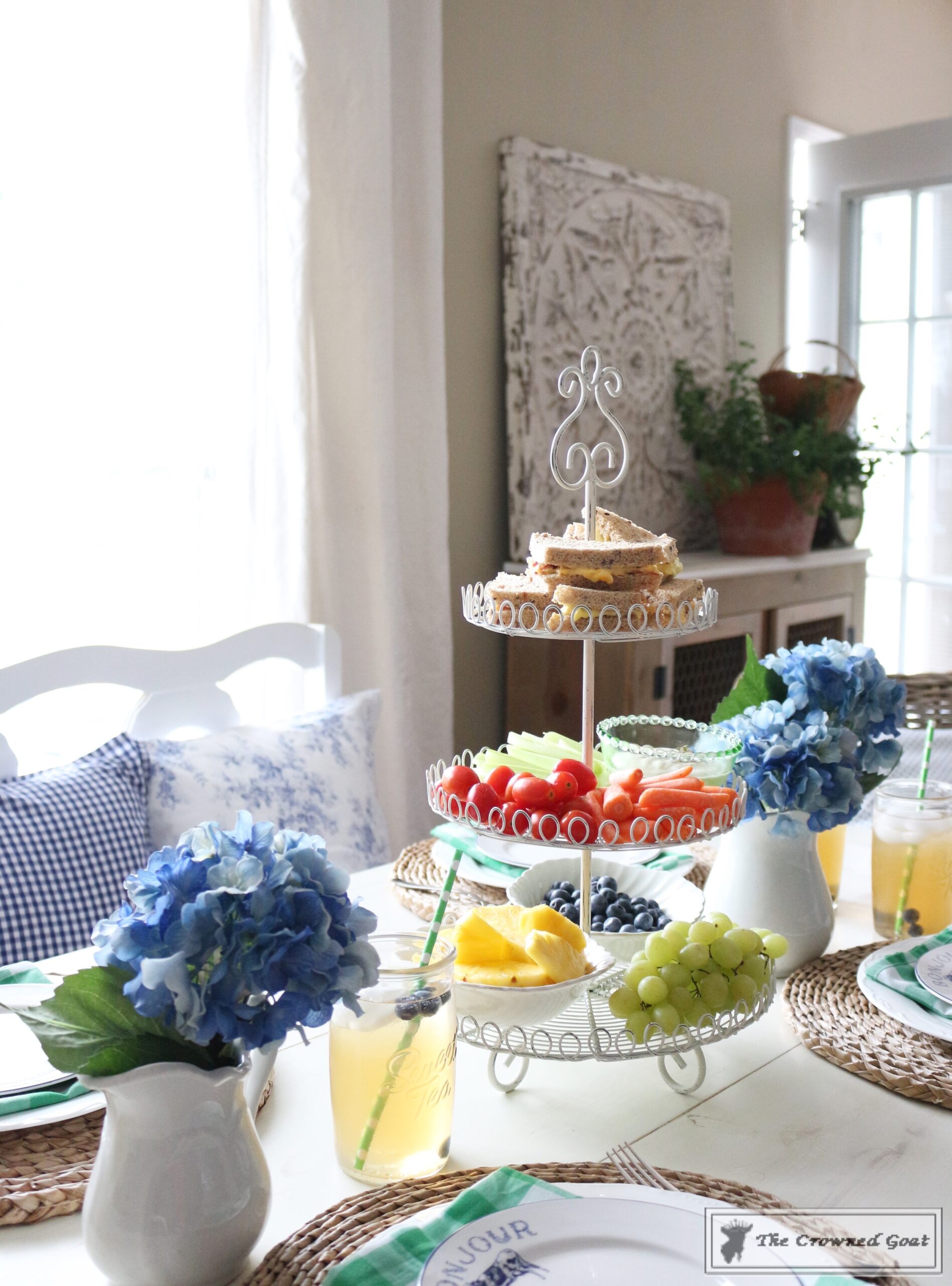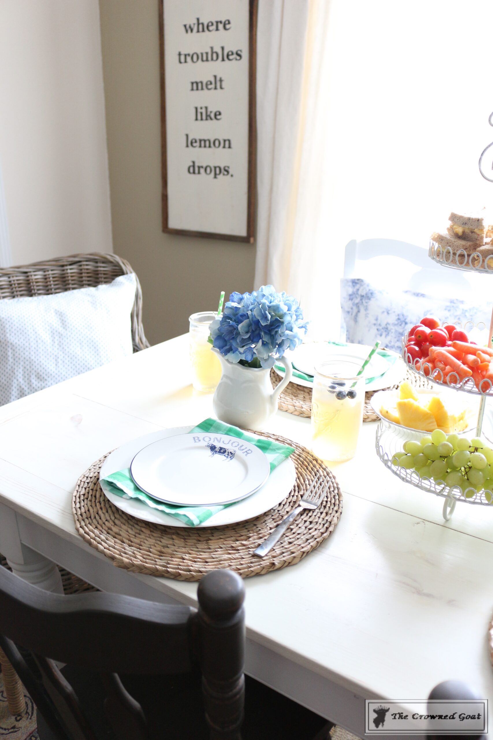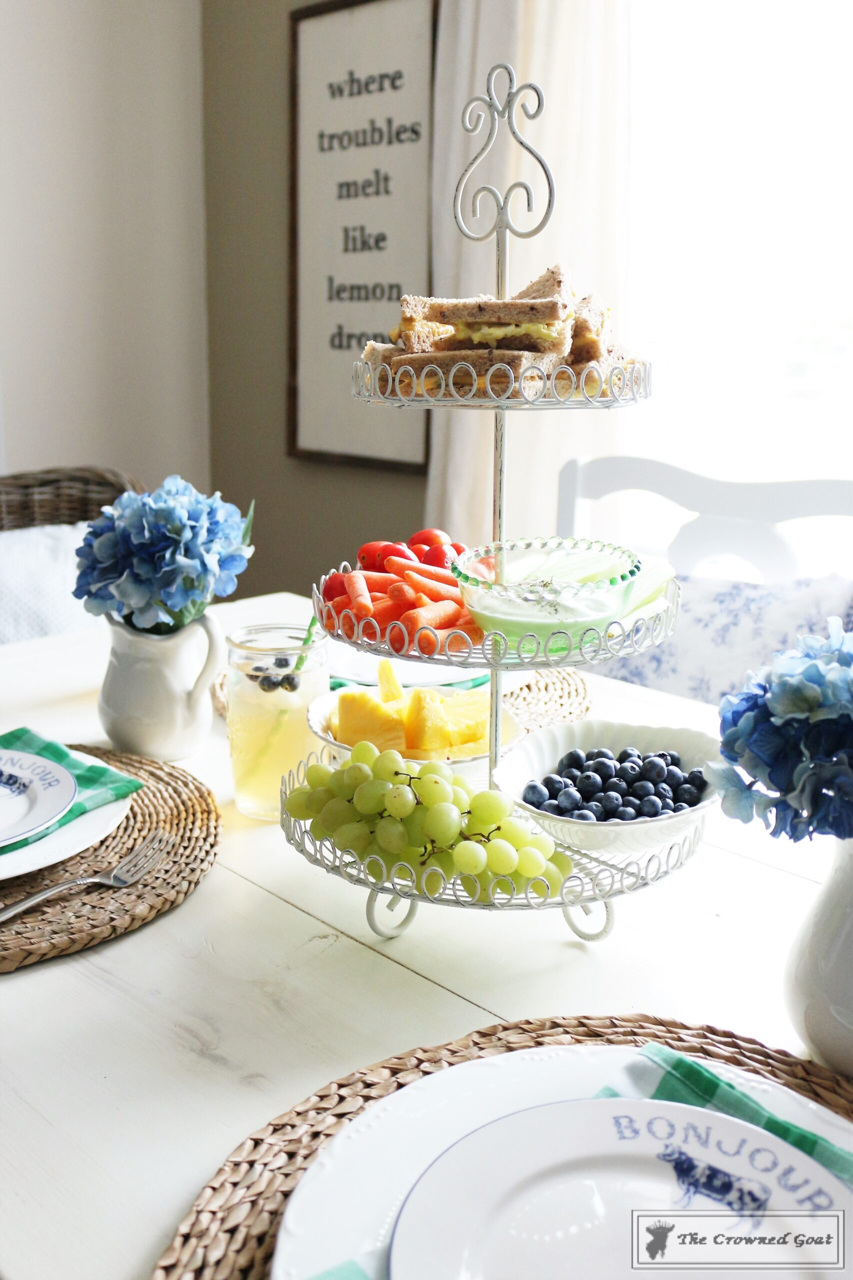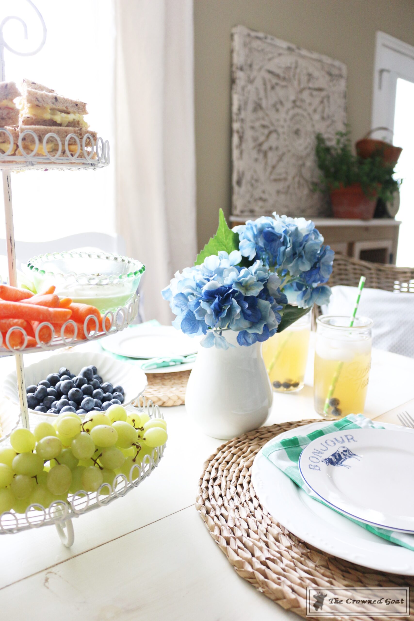 The thing I love most about summer is how relaxed everything becomes. It feels like time is measured in glasses of sweet tea, slices of pie and scoops of ice cream. Even though it has been crazy-hot lately, we love to eat outside whenever we can and especially love to picnic. I had all of the supplies ready to go when a rainstorm snuck up on us and threatened to cancel our big plans. I couldn’t bear to disappoint them so I told the kids to color in the living room while I set up our indoor picnic at the breakfast table. It was so quick and easy to put together I thought I would share in case you find yourself hosting an impromptu lunch, afternoon tea or have friends drop by for dessert and coffee on the porch.