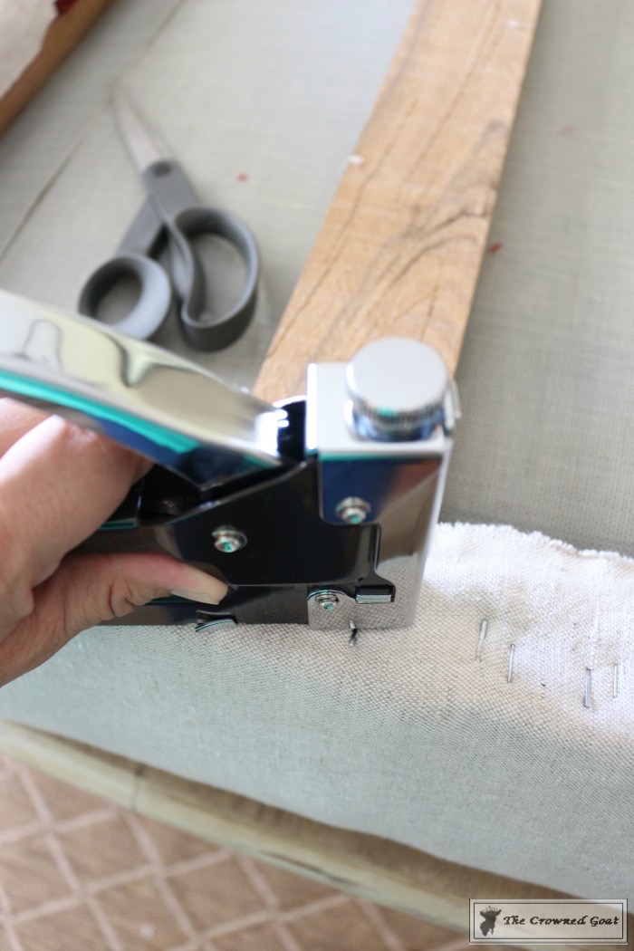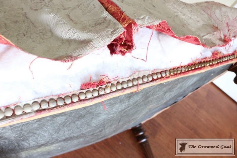 The first step was to remove about 200 individual upholstery tacks. It took hours! I was seriously like what in the world have I gotten myself into! Seriously, if you guys decide to do this use caution and care as tacks are sharp.