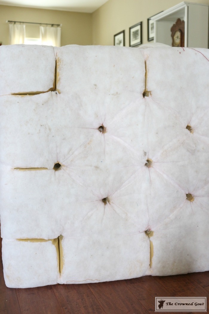 Once the old fabric was removed, I decided to use a medium-weight quilt to help cover the tufting holes and to provide a bit more cushion/stability to the ottoman in addition to keeping the existing batting.