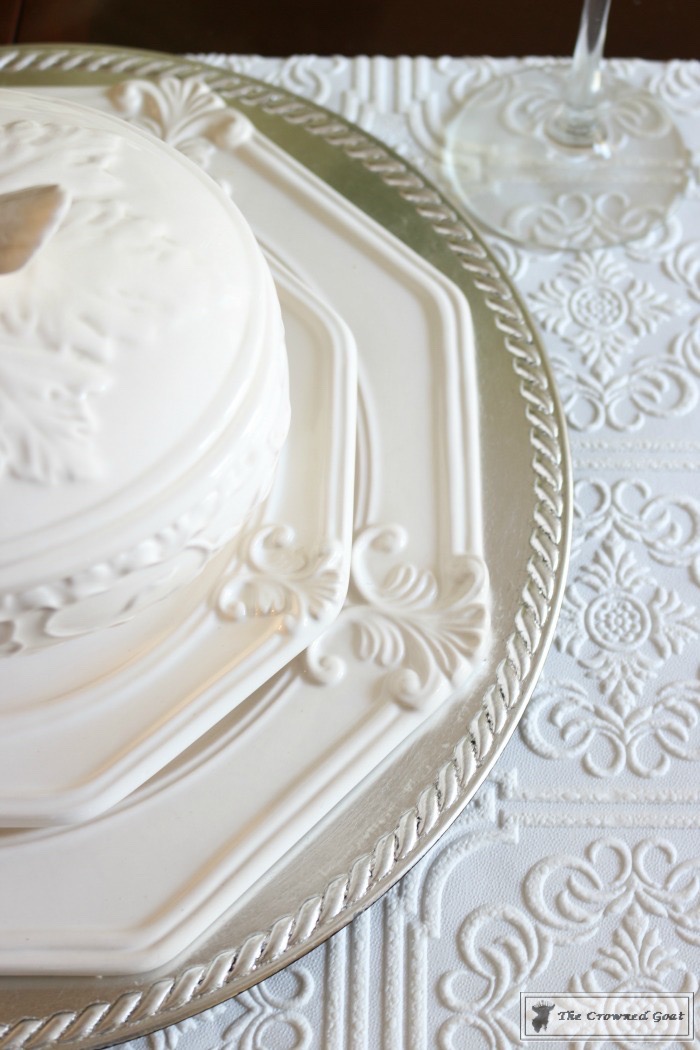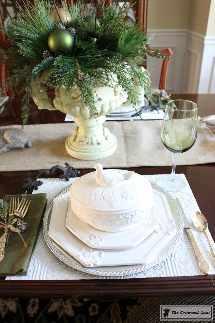 Given the china cabinet, dining room table, chairs and chandelier are on the formal side, my mom chose a simple place setting. Don’t you love these white bird tureens?
