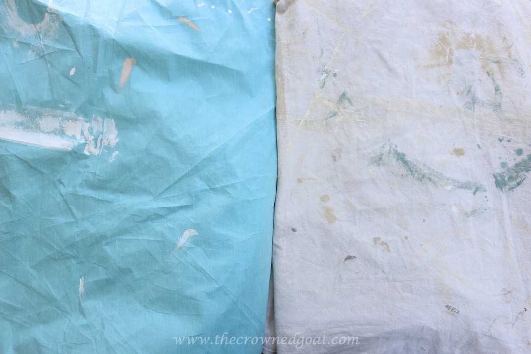 I use both a canvas drop cloth as well as this Trimaco (the blue one) drop cloth. The blue drop cloth feels a bit like paper. It’s leak proof, slip resistant, reusable and perfect for large areas. You can find both of these at Lowes.