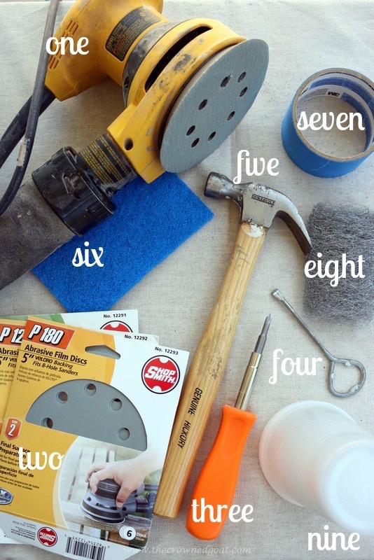 It’s also really important to have protective eye wear (currently on my head), gloves, mask/respirator and an apron to protect your body/clothing (currently wearing). I know a lot of you guys rescue pieces from old barns, estate sales and the curb too. You can’t be too careful when it comes to protecting yourself while your DIYing.
