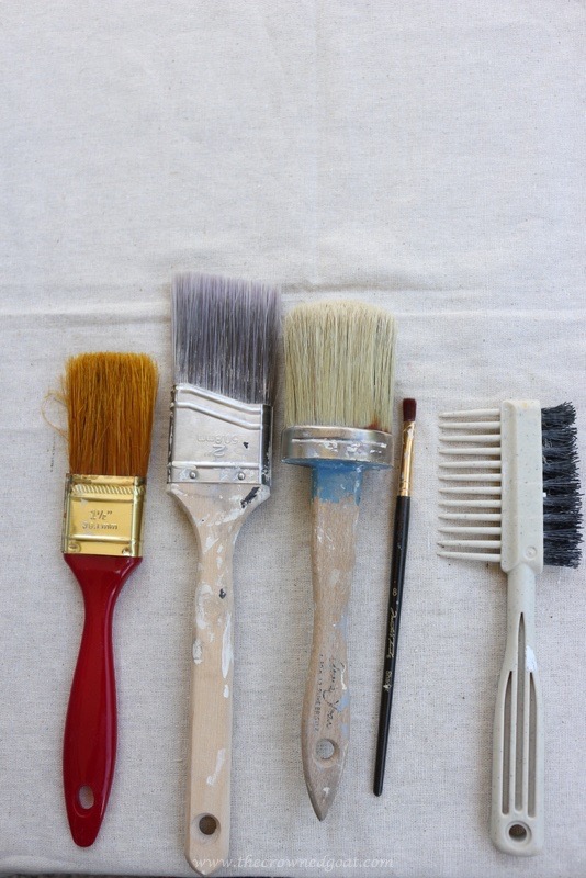 Finally, one of THE most important things you can do to improve your furniture painting is to invest in a good quality brush. I use a different brush for staining, painting with chalk paint, latex paint, applying topcoats and small detail work. You don’t need to have all of those brushes in your paint bag. It’s just my personal preference not to mix mediums. A 2 inch brush will do you right with almost any project. The brush on the end is for cleaning brushes. I would be lost without it.